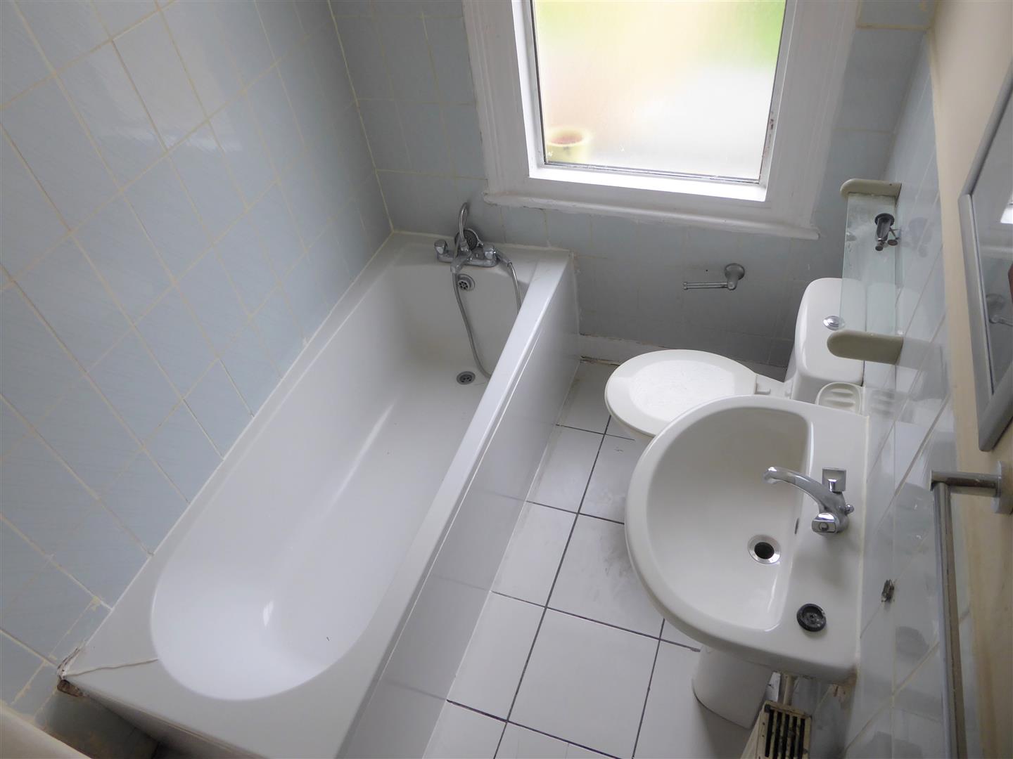 Bathroom - White suite comprising panel enclosed bath, pedestal wash hand basin, low level w.c, tiled walls and flooring, rear aspect double glazed window