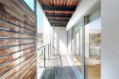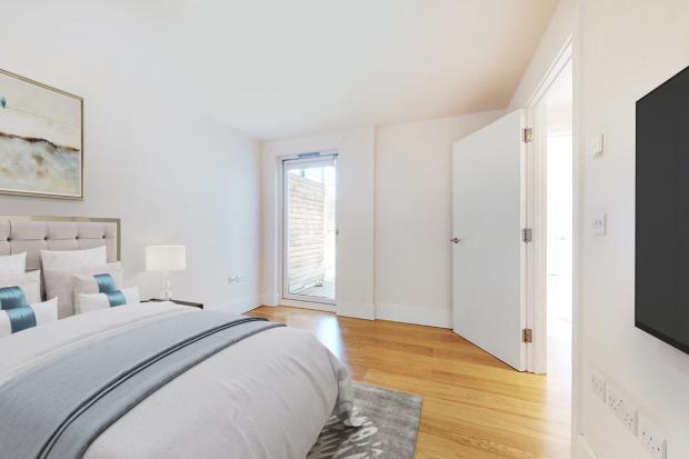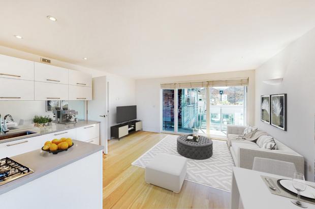 The apartment comprises a spacious living room and fully fitted open plan kitchen with high spec Neff appliances and centerpiece Island with stove. The living room leads out through floor to ceiling glass doors to the private balcony which gives a delightful peaceful courtyard view. The apartment has two double bedrooms, a master suite which also gives direct access to the balcony and includes a luxury fully tiled en-suite and the 2nd bedroom which enjoys a walk in wardrobe space. You also have a spacious main fully tiled bathroom suite with floating sink and toilet and also a utility cupboard. The apartment boasts high quality finishes, under floor heating, floor to ceiling windows, spotlights in the ceilings and secure video entry system.