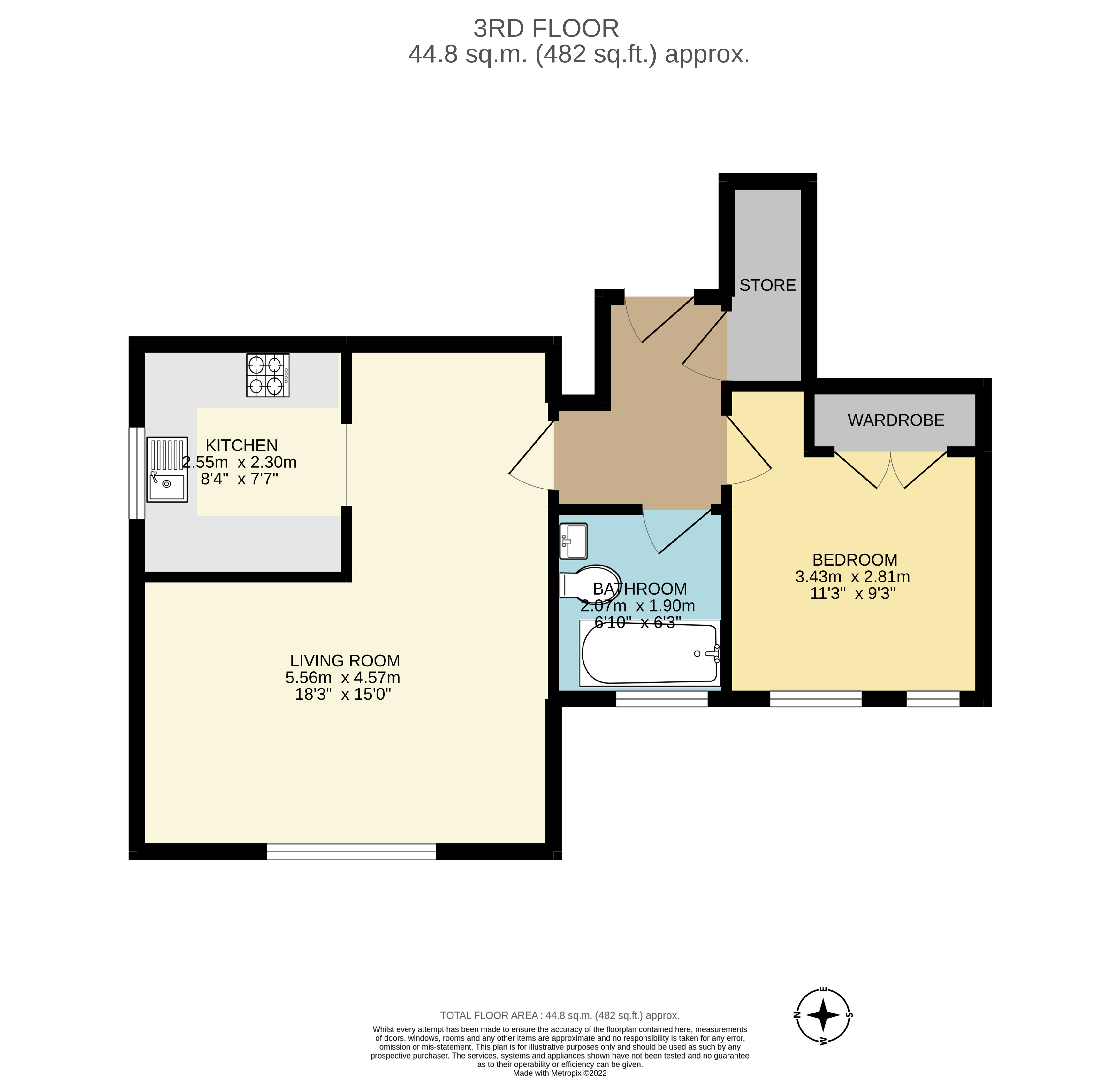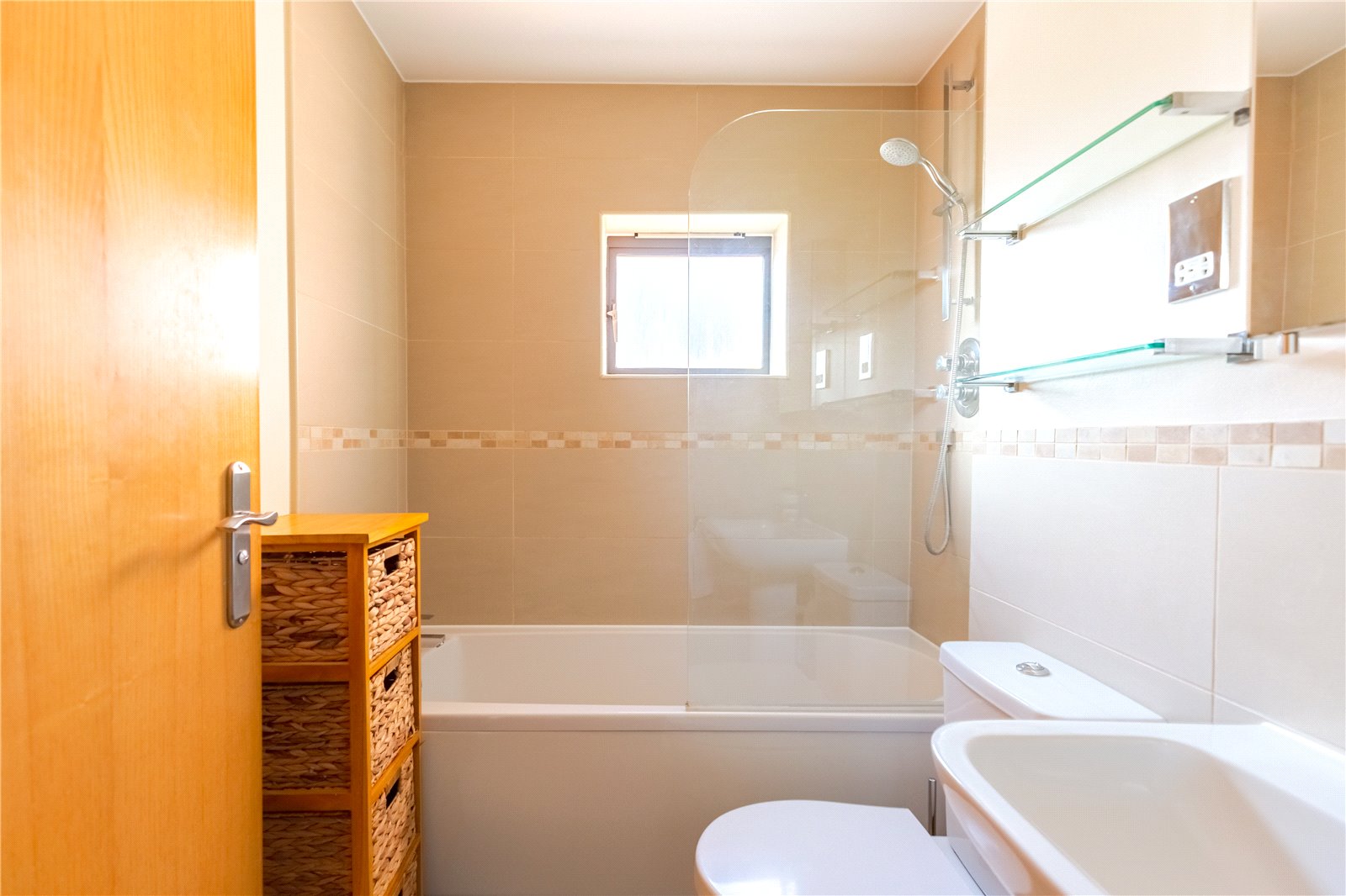 Complete with built-in wardrobe, the bedroom also offers further space for freestanding furniture, and benefitting from two windows that fill the room with light. Adjacent sits a contemporary bathroom suite complete with full bathtub and wall-mounted shower, finished with a natural stone effect tile surround. The property further benefits from built in cupboard off the hall, new flooring and private parking space outside the building.