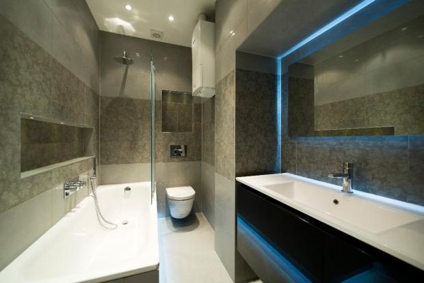 Luxurious bathroom boasting heated floors, brand new three piece bathroom suite, Japanese head shower, hose head, cut ours with down-lights, Led lights under bath, Gloss black pedestal hard wash basin and vanity unit.