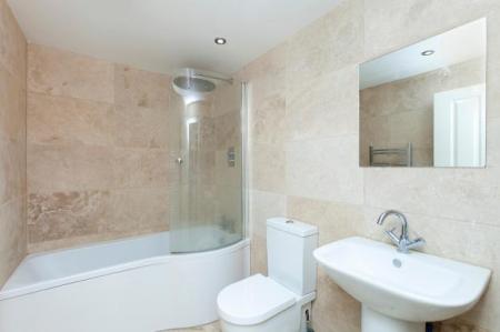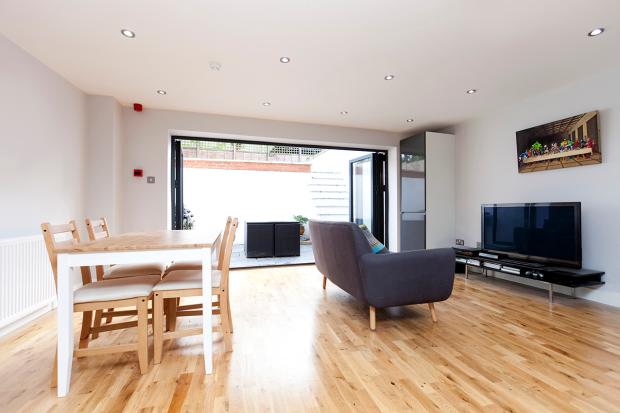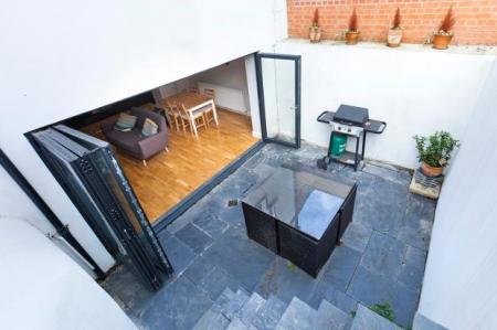 The apartment boasts a stunning open plan fully fitted kitchen featuring stylish grey gloss integrated surfaces with all ‘Bosch’ appliances and real wood counter, that opens into the feature reception room leading out to the large patio space through floor to ceiling bi fold doors. The patio takes you through to a luscious raised private garden an ideal space for entertaining. You also have two spacious and secluded double bedrooms. A modern bathroom with curved bath, large Japanese showerhead over bath and fully tiled with travertine stone. The property boasts real wood floors throughout, spot lights in the ceilings with dimmer switches and lots of storage.