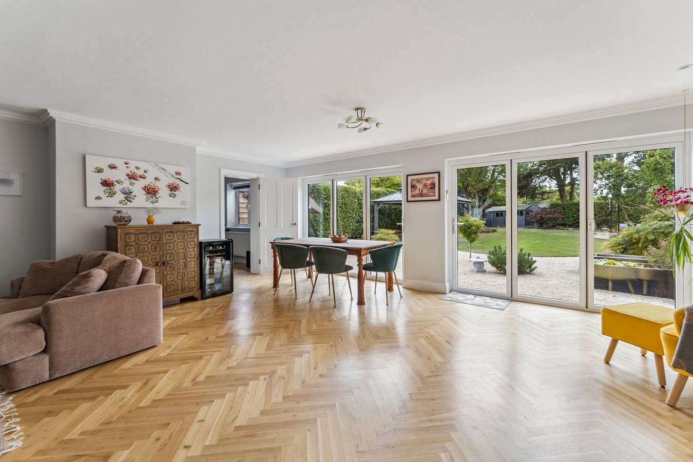You enter the property via an entrance porch and into a spacious hall which features a pretty bay fronted window and stunning herringbone flooring, which in turn is a real feature throughout the ground floor. The hallway gives you direct access to a cloakroom, the kitchen/dining area, and the sitting room.