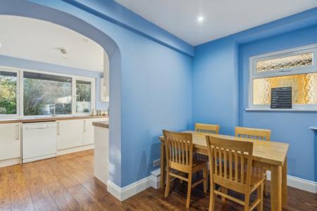 The kitchen, which benefits from eye and base level units and an integrated cooker. This room is connected to a very convenient space for a dining table and chairs as well as a down stairs W/C.