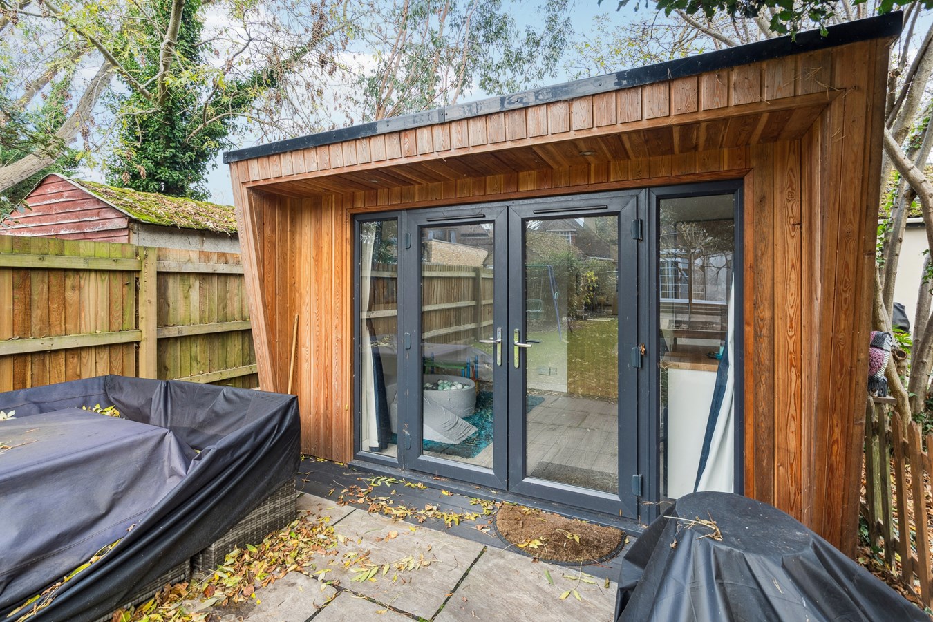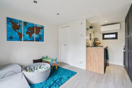 The rear garden hosts an impressive, beautifully crafted wooden garden room that serves as a self-contained and highly adaptable space. With French doors, laminate flooring, and modern kitchen units including a stainless steel sink, it is perfectly suited for use as a home office, studio, guest suite, or creative retreat. A private shower room with toilet and basin completes this excellent addition, offering comfort and independence for its occupants.