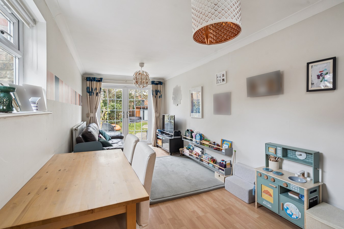 The property welcomes you into a bright hallway where the ground-floor family bathroom is conveniently situated, fitted with modern fixtures and perfectly placed for both guests and day-to-day use. From here, the home opens into a superb kitchen and family room that forms the true hub of the property. This generous space features a stylish wooden shaker-style kitchen with a double sink, double oven, gas hob, and a moveable central island that provides extra workspace and a sociable centrepiece for cooking and entertaining. The adjoining family area is filled with natural light through French doors that lead directly onto the garden and an additional side window, creating a warm and inviting atmosphere enhanced by contemporary laminate flooring. A useful utility room adjoins this space, offering further storage, housing the boiler, and providing room for appliances.