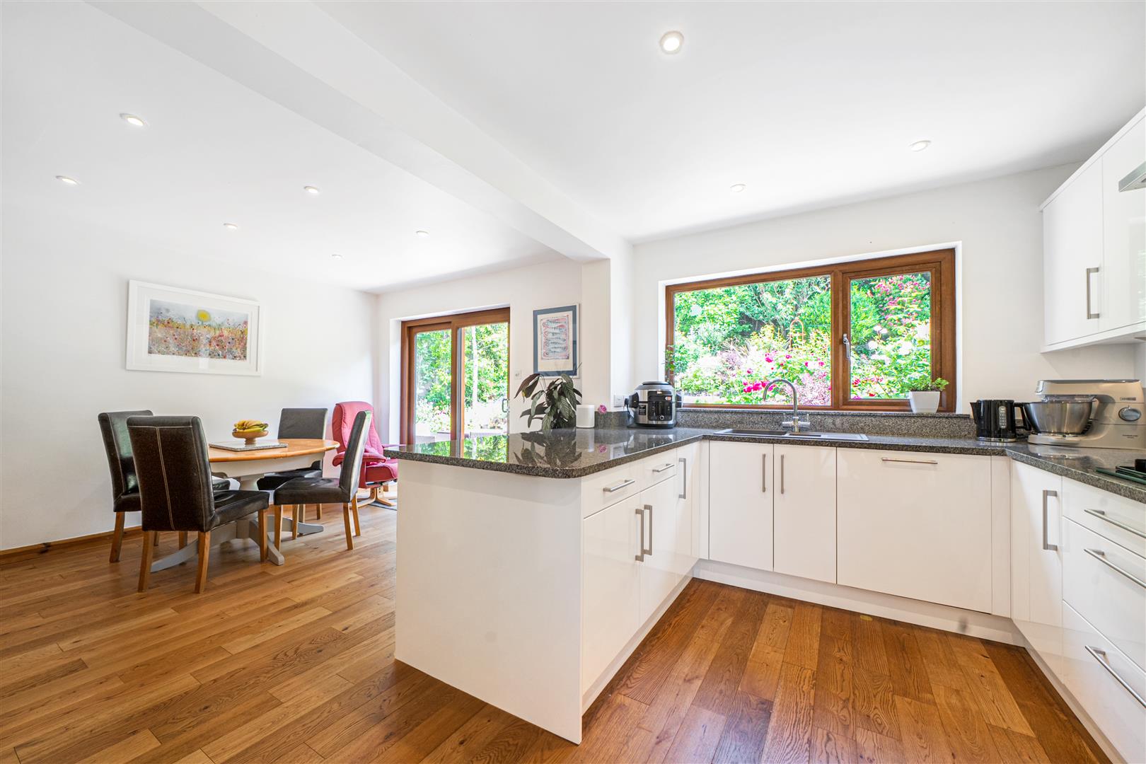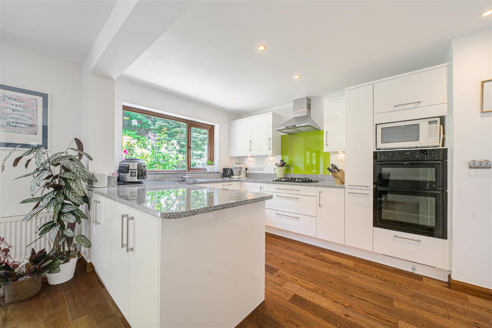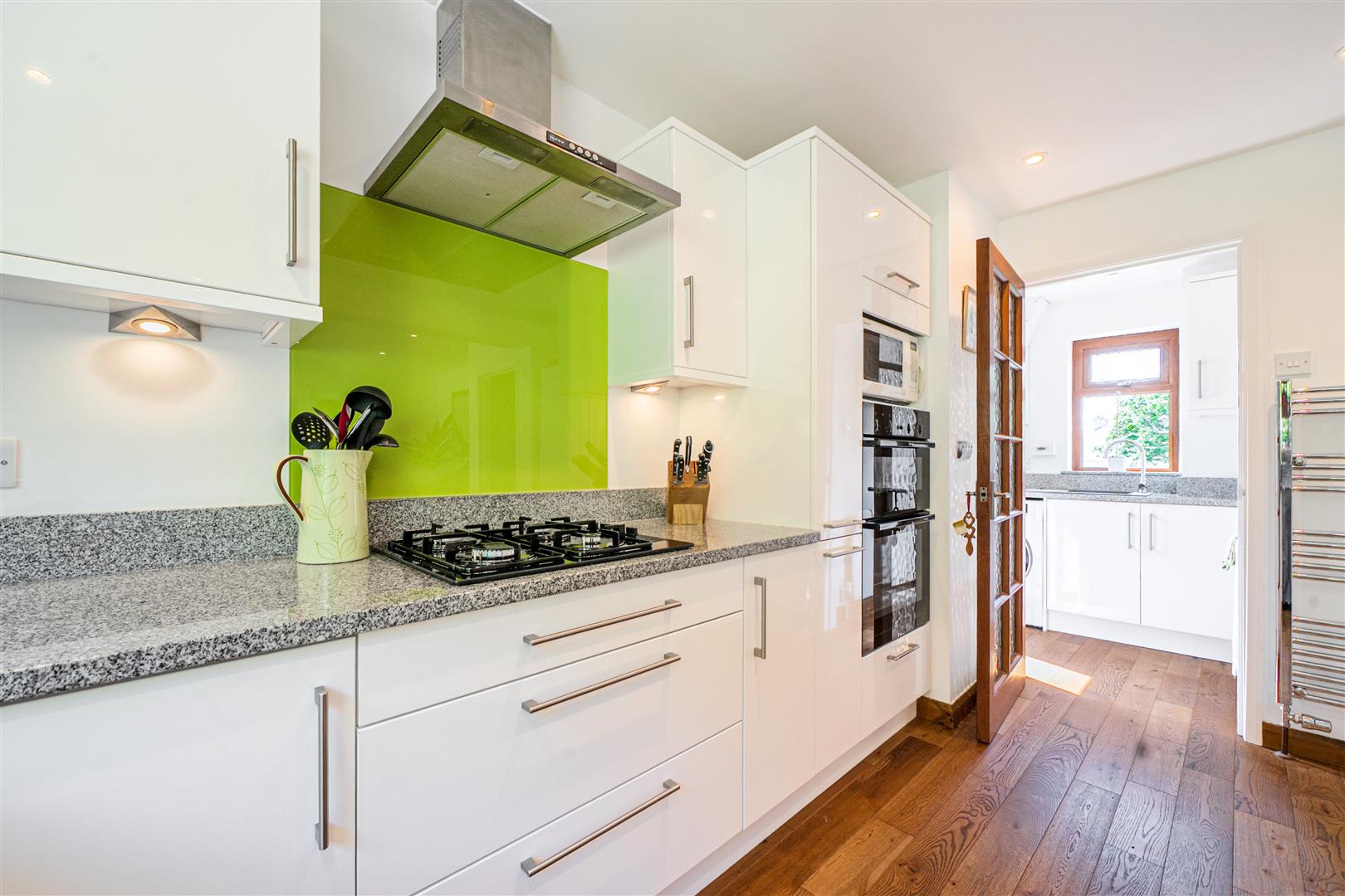 The modern kitchen delivers an incredibly sleek feel, with light bouncing off the glossy white units and integrated appliances whilst a vibrant, lime backdrop to the hob brings a burst of colour to this well-appointed room. There is space for a family size dining table making this room great for entertaining.
