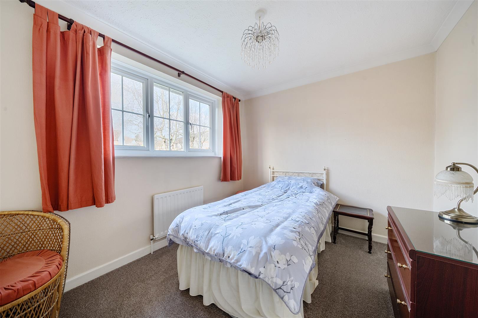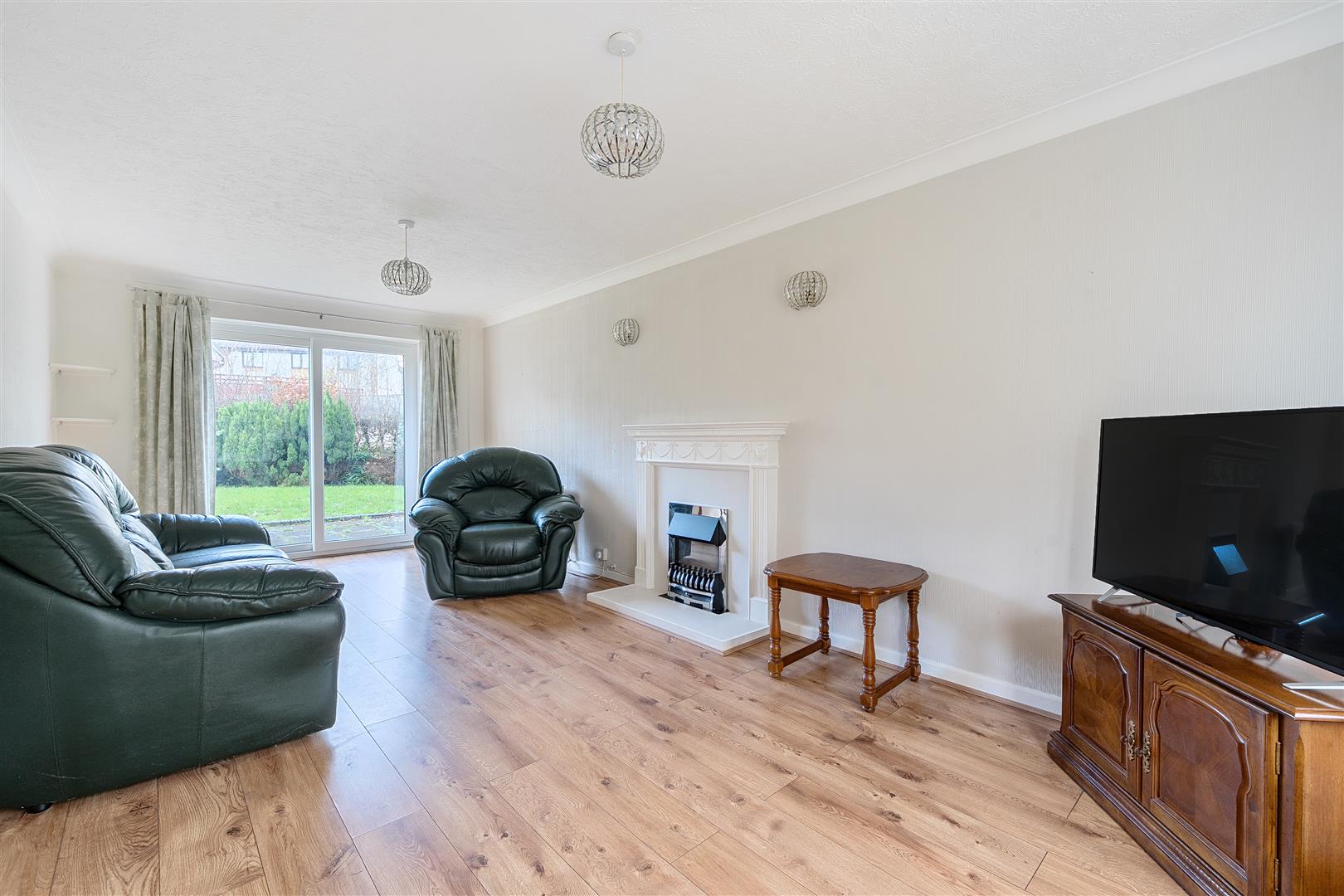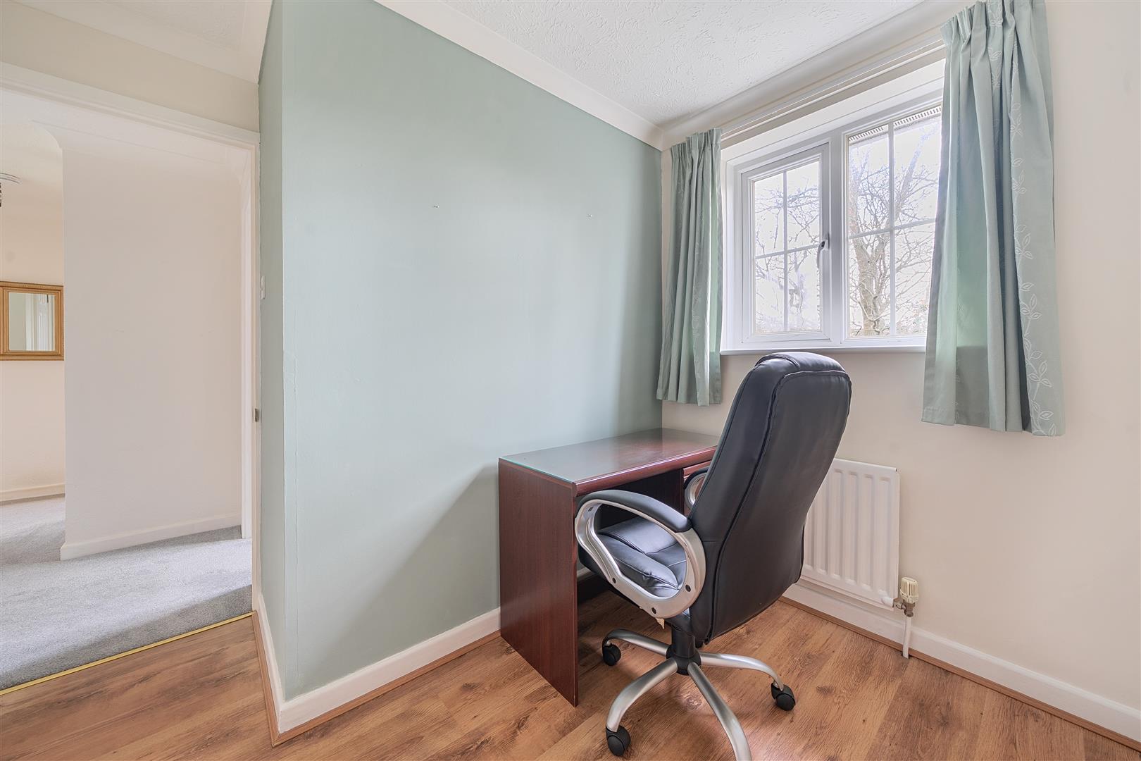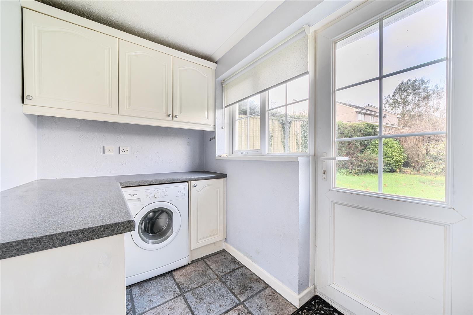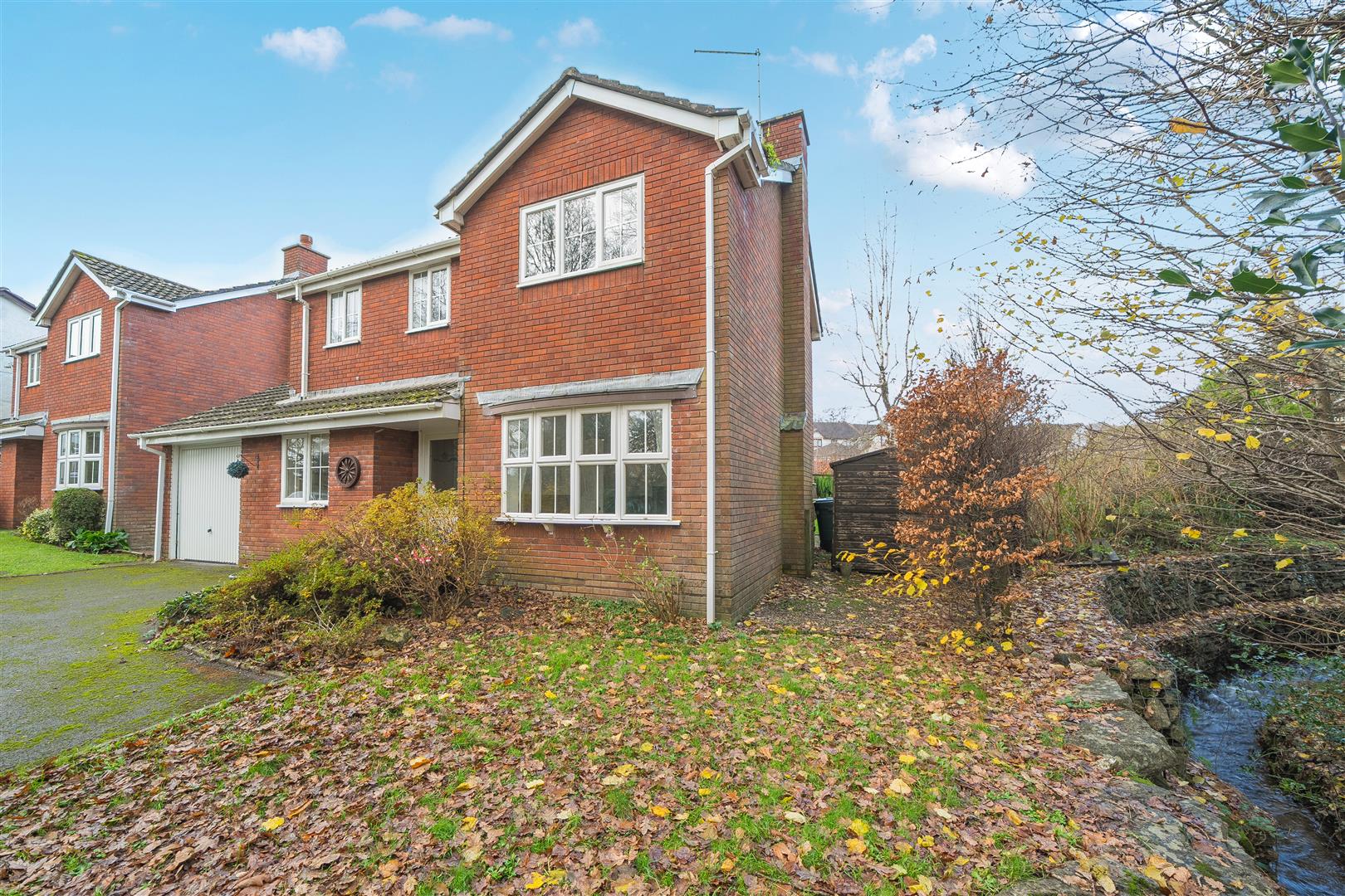 Outside, the level driveway is bordered by a large area of lawn with a small section of stream trickling past the eastern boundary that joins up with the pond at the nearby verdant Woodland Park. There is bilateral access to the rear garden that is enclosed by high fencing and framed with established shrubbery and there is a large, level lawn as well as a generous patio that can also be accessed from the sitting room - a super spot to share time with family and friends.