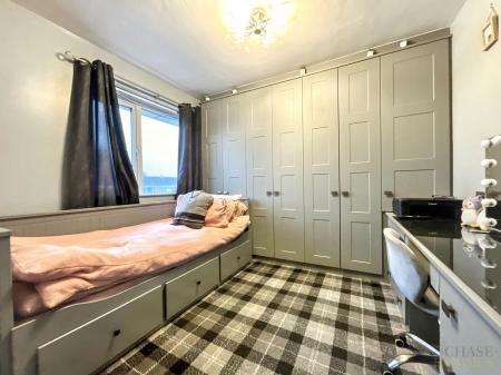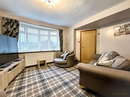The spacious living area features a large bay window, filling the room with natural light and creating a welcoming space for relaxing or entertaining. The modern kitchen boasts sleek units and plenty of storage, ideal for cooking or keeping everything organised.