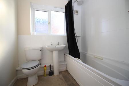 White suite comprising of panelled bath with mixer tap, pedestal wash hand basin, low level WC, tiled splash backs, extractor fan, double glazed side window