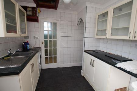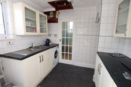 Double glazed window to side, single drainer sink unit set in work surface, range of base and eye level units, space for washing machine, access to lobby and