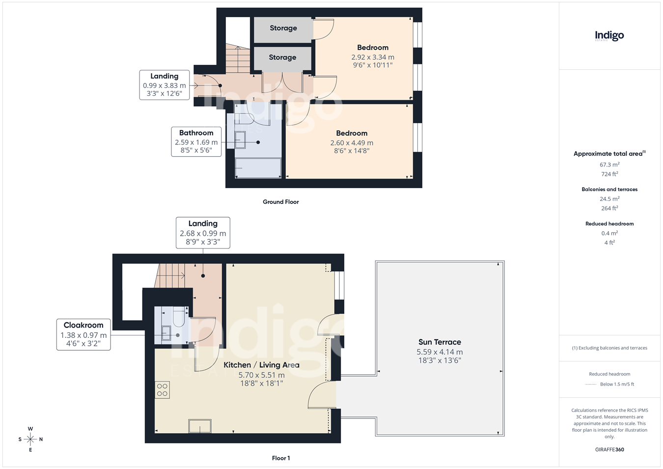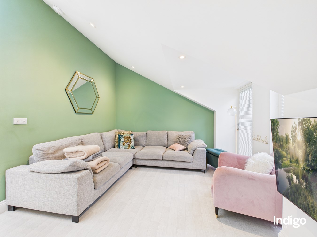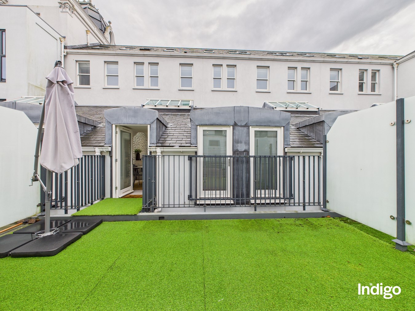 The property comprises two generous double bedrooms, a modern house bathroom, and an additional upstairs cloakroom, with ample built-in storage cleverly integrated across both levels. The open-concept living space is bright and welcoming, featuring vaulted ceilings, a fully integrated kitchen, and plenty of room for dining and entertaining. This space opens directly onto a private sun terrace laid with artificial lawn, creating a seamless indoor-outdoor flow.