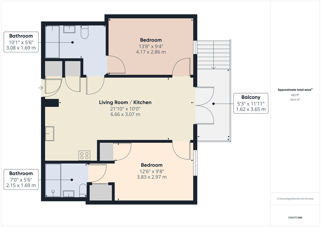 - Two bedrooms and two bathrooms
