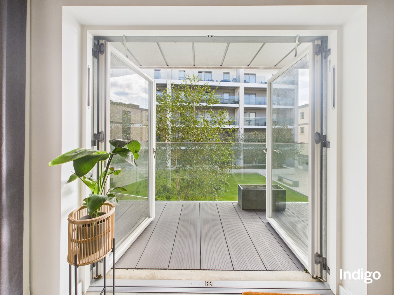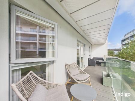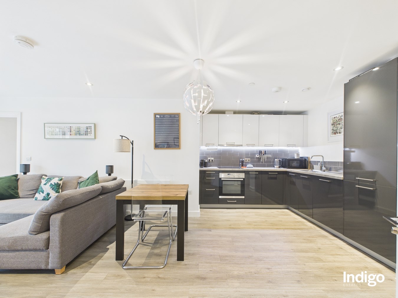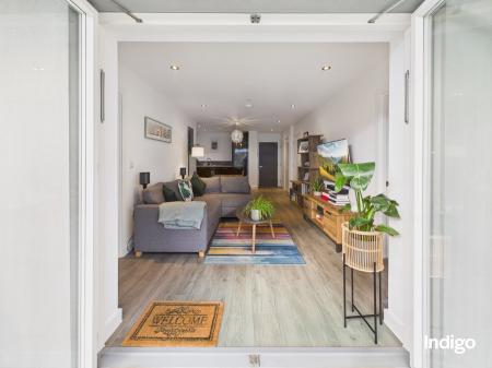 Beautifully presented throughout, the property features two double bedrooms and two bathrooms, including an en suite shower room and a jack and jill bathroom, together with a bright open-plan living and dining area and a fully integrated kitchen. The living space opens directly onto a large decked balcony with glass balustrade, perfect for enjoying morning coffee or evening relaxation.