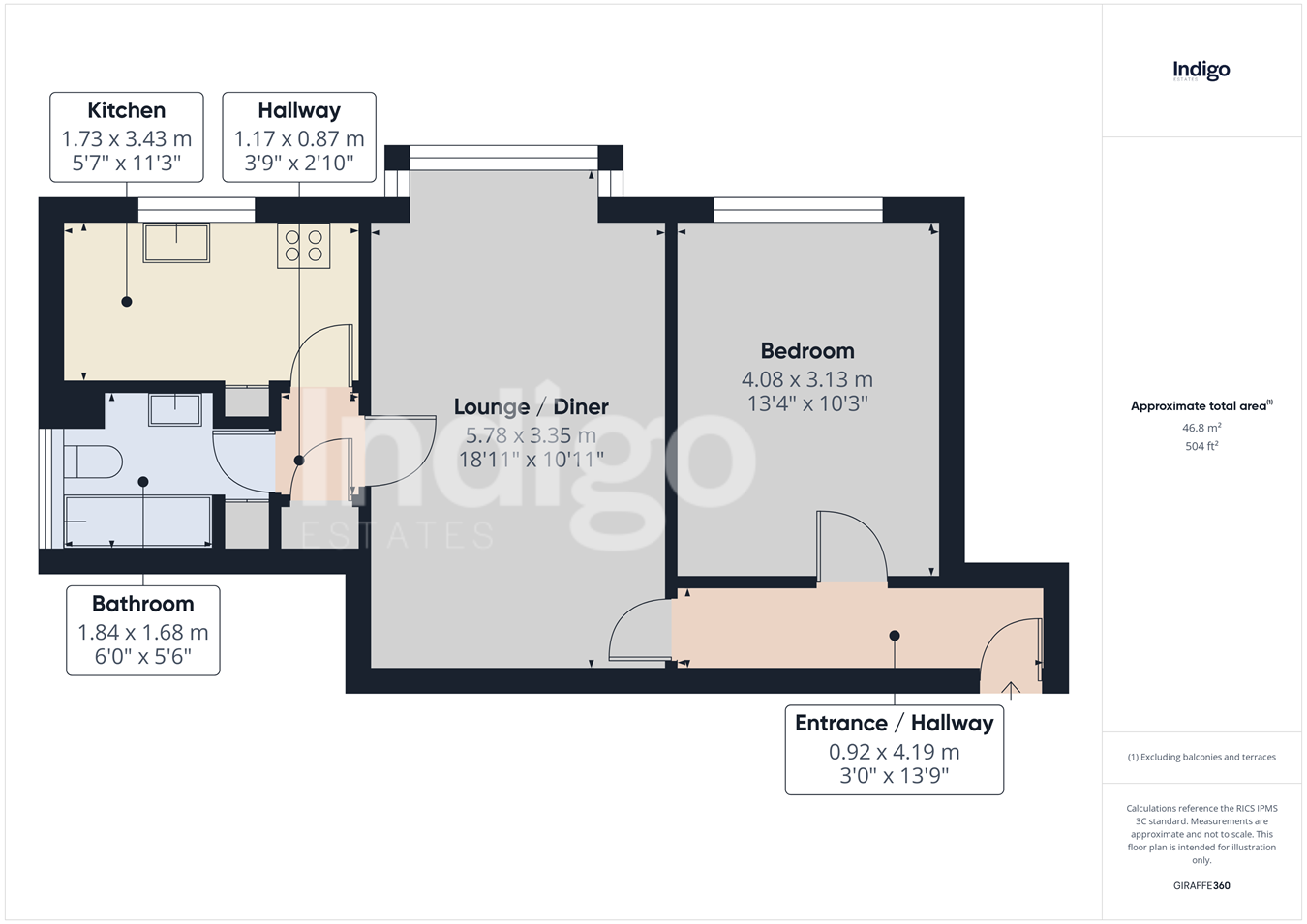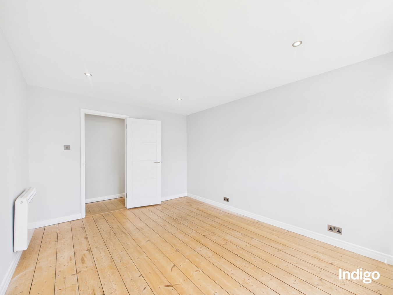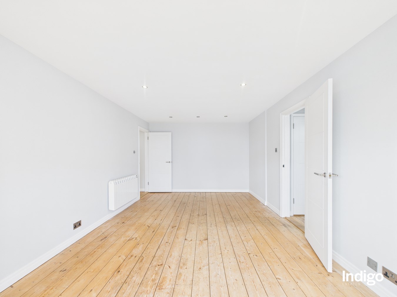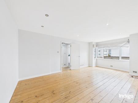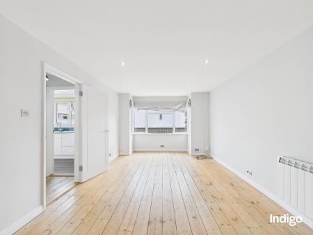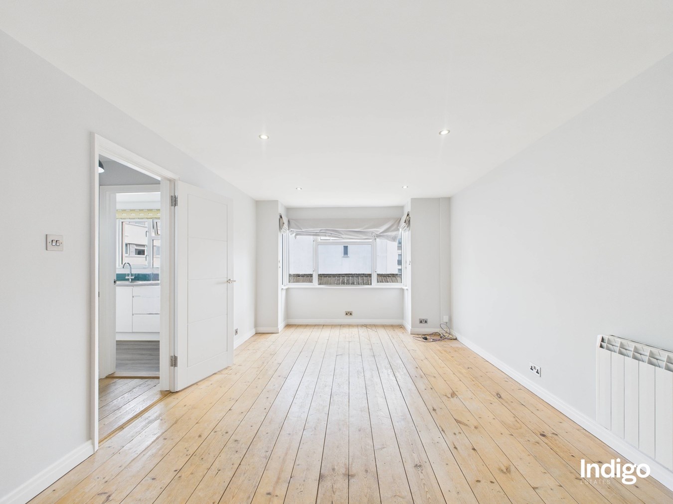 The property features a spacious and light-filled living room with dining area, a separate fitted kitchen complete with storage cupboard, a well-proportioned double bedroom, and a modern bathroom.