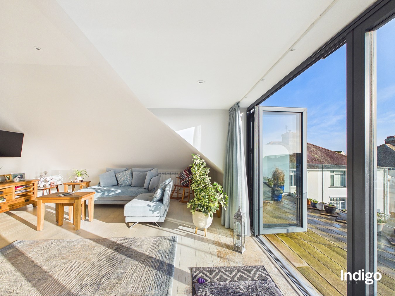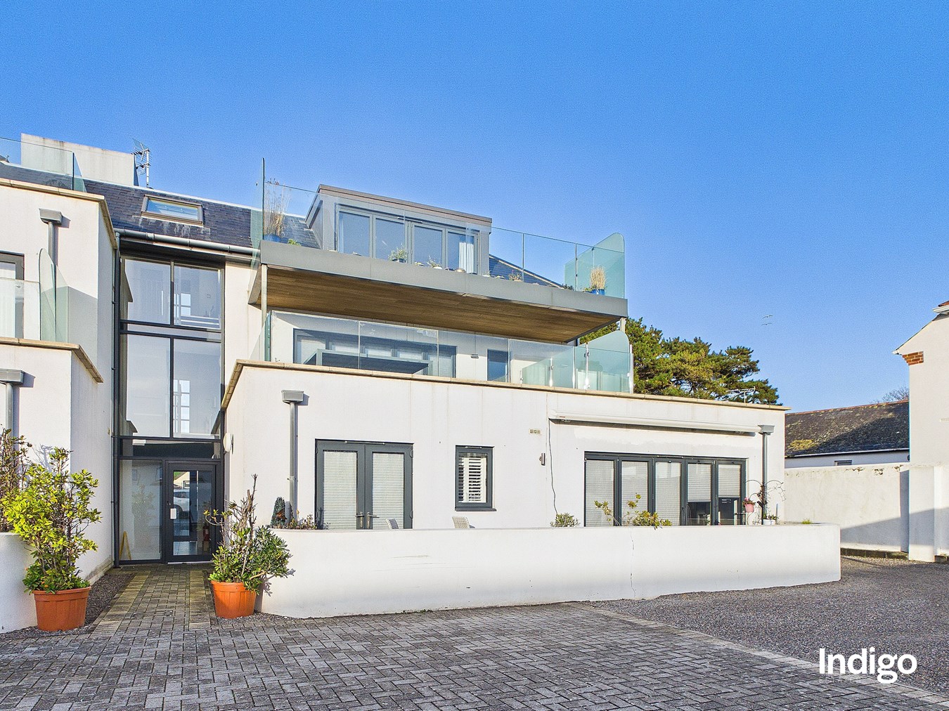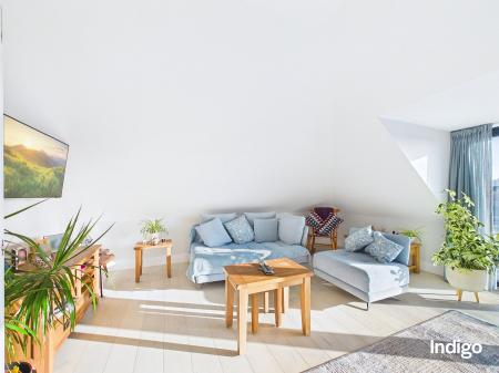 This beautifully bright and contemporary penthouse apartment enjoys an enviable position quite literally on the doorstep of the renowned Samares Manor, offering stylish modern living with an abundance of natural light and generous outdoor space.