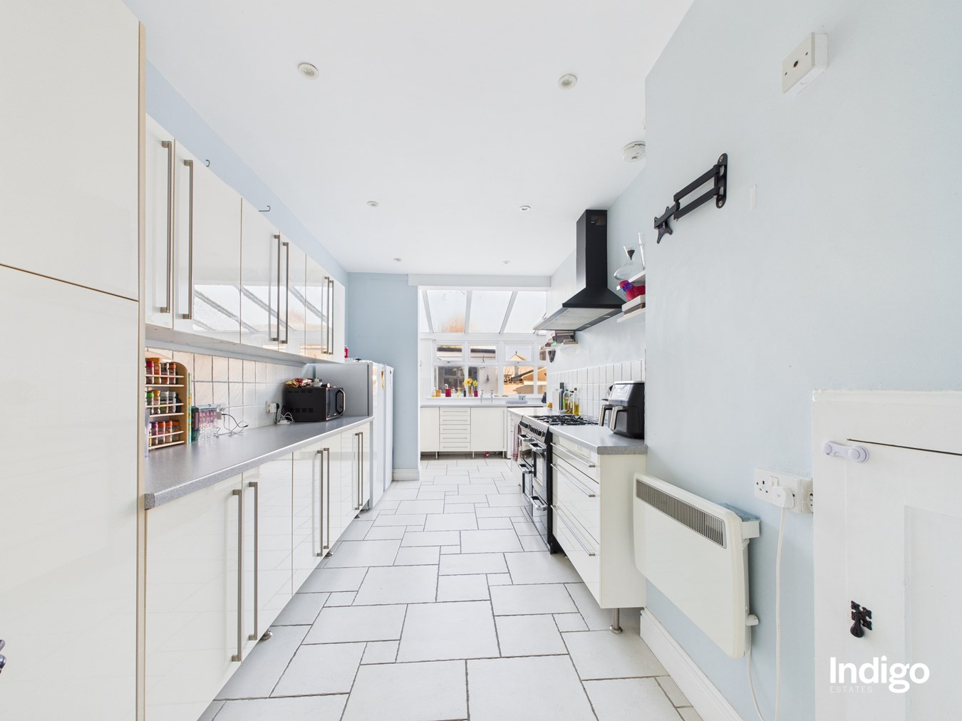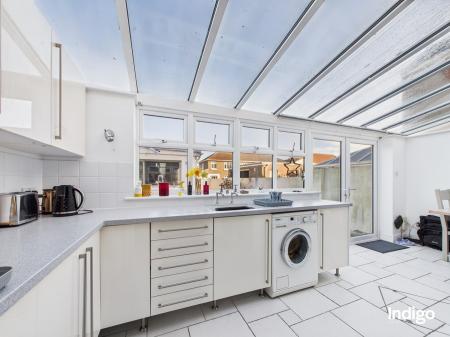 The accommodation comprises three bedrooms and a house bathroom, along with a comfortable living room and a separate dining room. A modern wrap-around kitchen with dining area forms the heart of the home, featuring doors that open directly onto the rear garden, ideal for family living and entertaining.