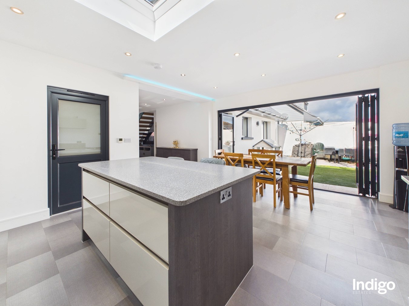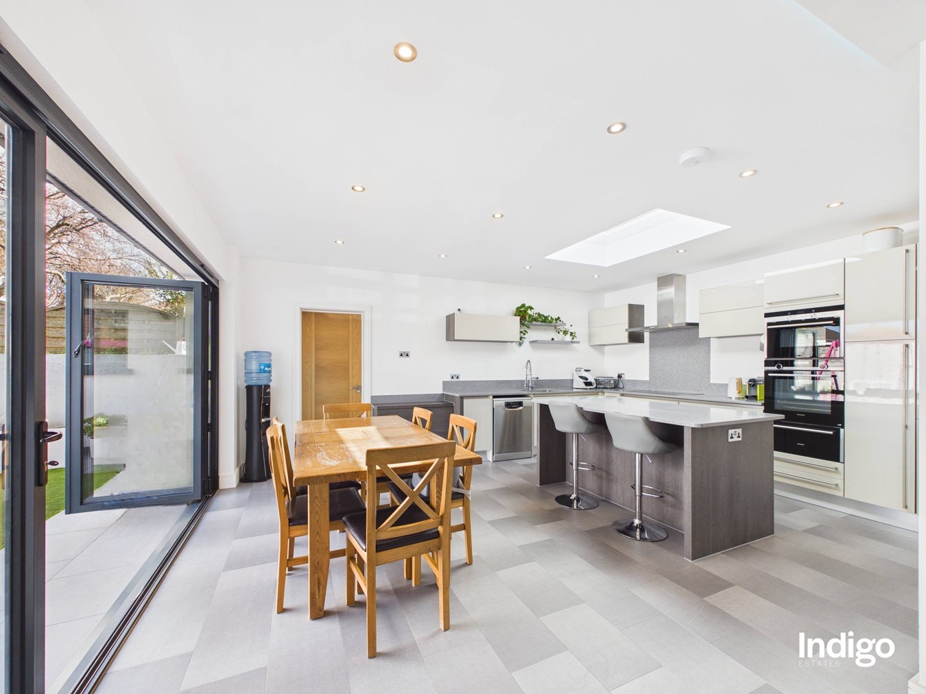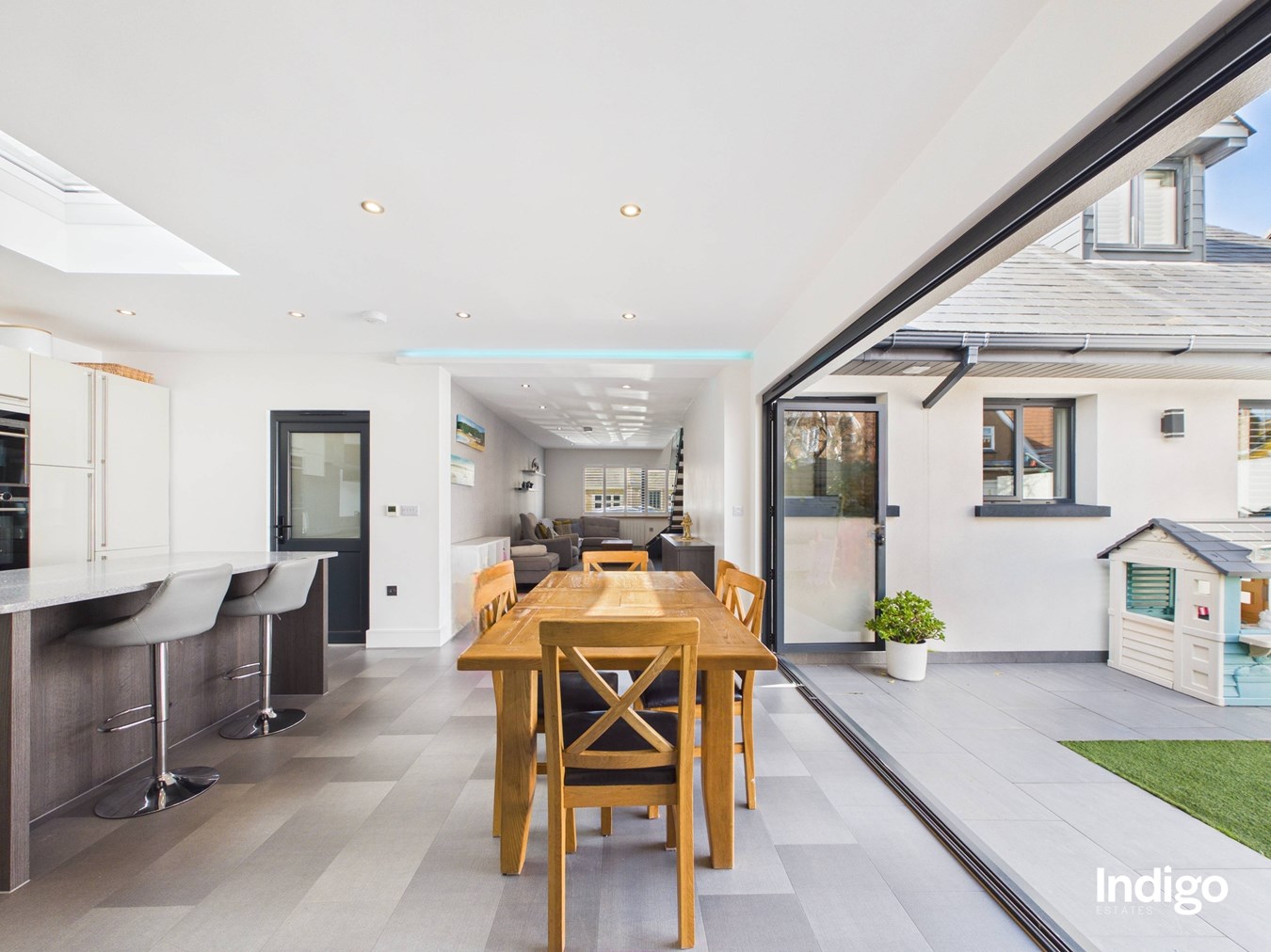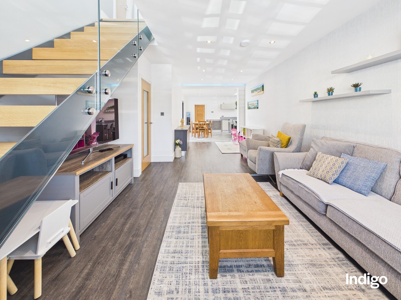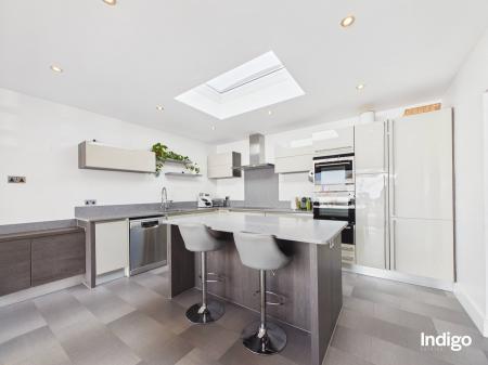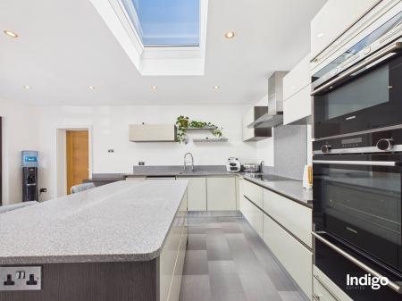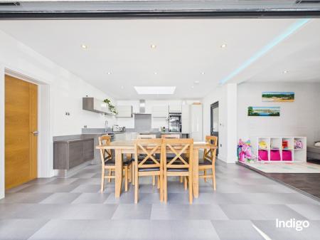 This beautifully presented property offers four bedrooms and three bathrooms, including an impressive principal suite occupying the entire first floor, complete with a separate dressing room and a stylish ensuite with walk-in shower. The heart of the home is the striking open-concept living space, enhanced by feature glass panelling and elegant solid oak steps that lead from the dining area into a fully integrated, high-quality kitchen with a central island. Bi-folding doors open seamlessly onto the garden, creating a natural indoor-outdoor flow ideal for both everyday living and entertaining. Further benefits include a separate utility room, single garage, and parking for up to five vehicles.