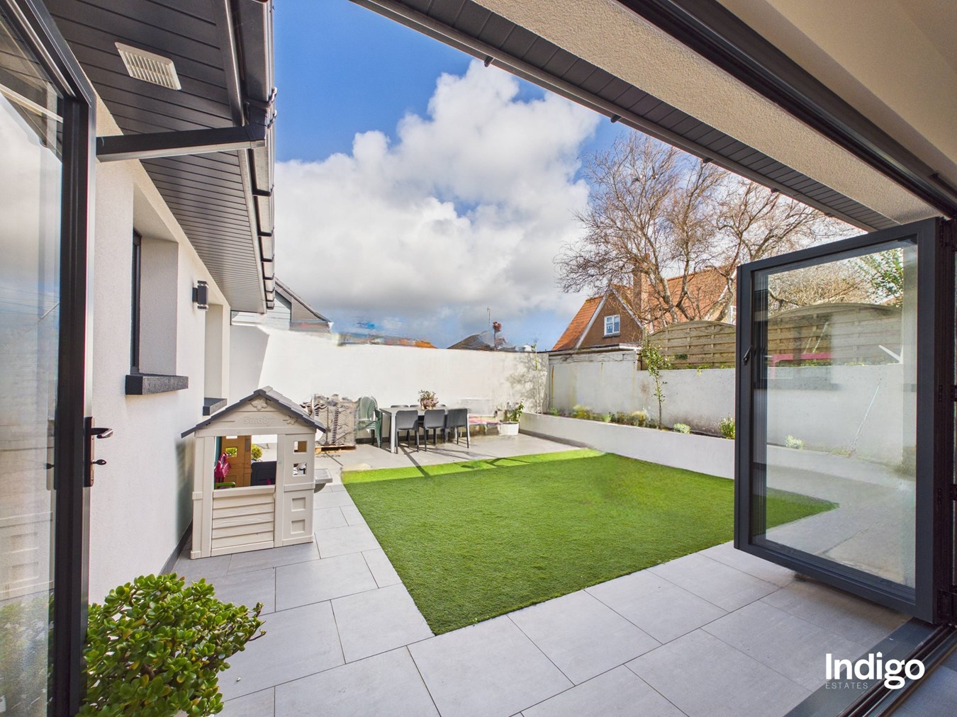 The hard-landscaped garden is designed for low-maintenance enjoyment, featuring artificial lawn, a patio area, and a dedicated storage room.