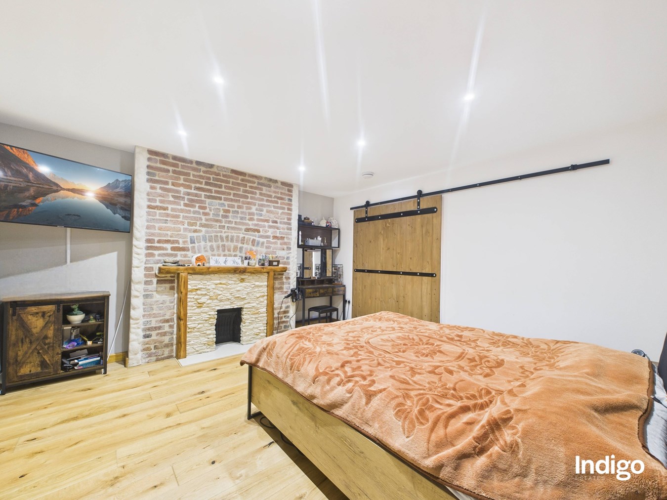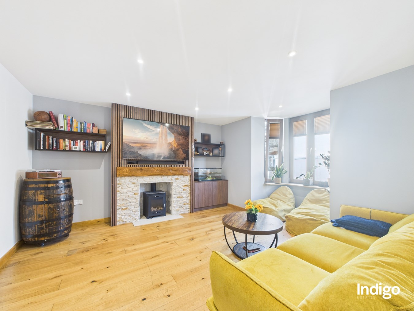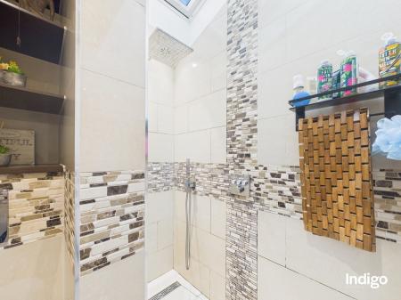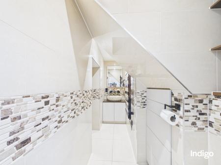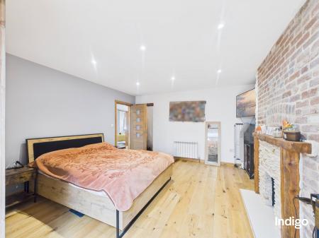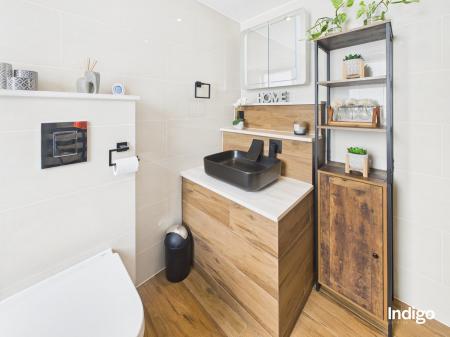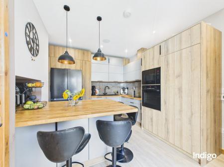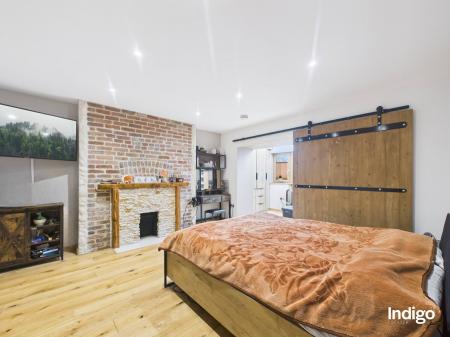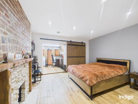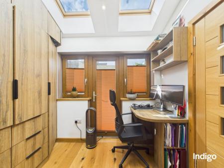 The generous layout includes two large bedrooms, with the master suite seamlessly opening into a dressing area and office beneath a vaulted ceiling, divided by a striking wooden sliding door. A high-quality upstairs bathroom is complemented by a stylish downstairs walk-in shower room with vaulted ceiling, while ample storage enhances the practicality of the home. The fully integrated kitchen, complete with breakfast bar and vaulted ceilings, flows directly into the private rear garden.