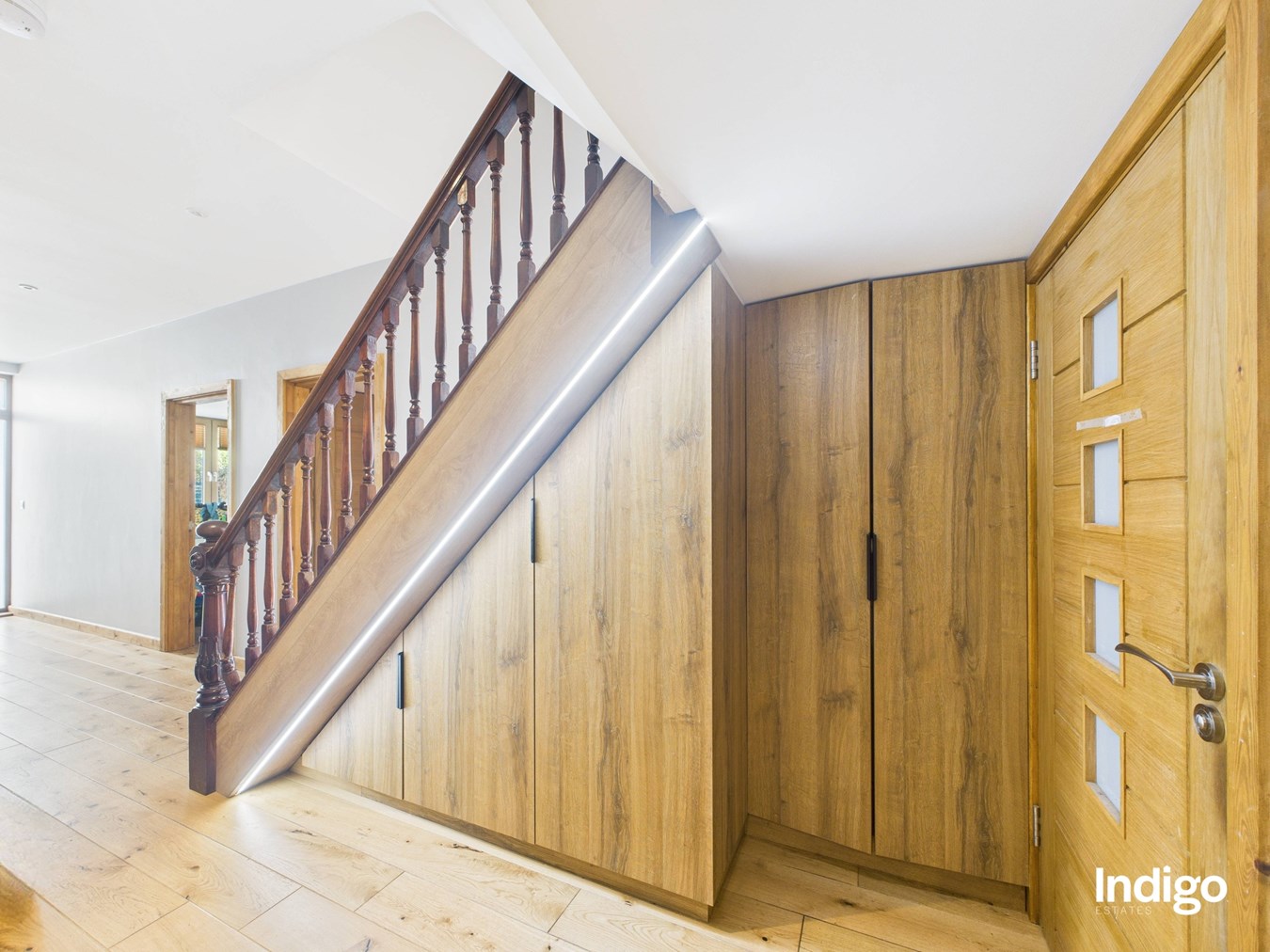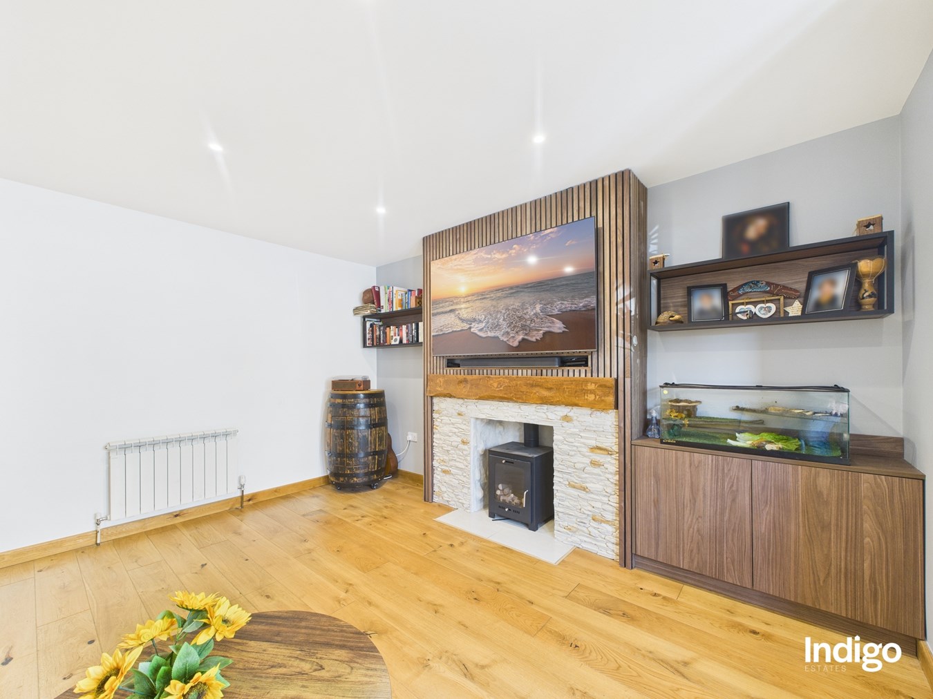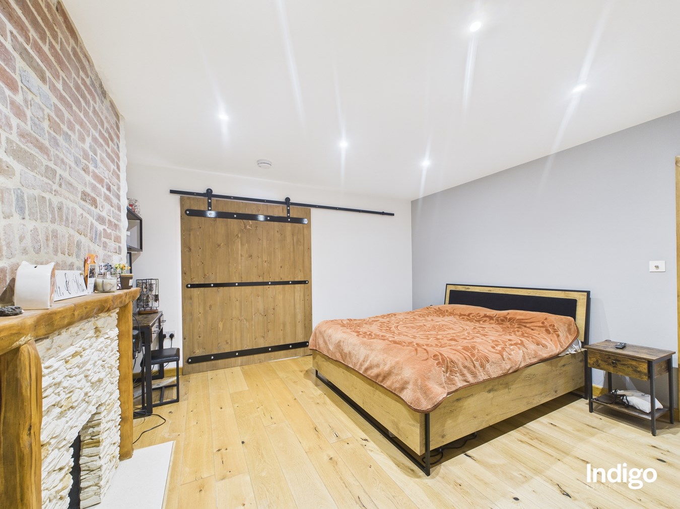 The generous layout includes two large bedrooms, with the master suite seamlessly opening into a dressing area and office beneath a vaulted ceiling, divided by a striking wooden sliding door. A high-quality upstairs bathroom is complemented by a stylish downstairs walk-in shower room with vaulted ceiling, while ample storage enhances the practicality of the home. The fully integrated kitchen, complete with breakfast bar and vaulted ceilings, flows directly into the private rear garden.