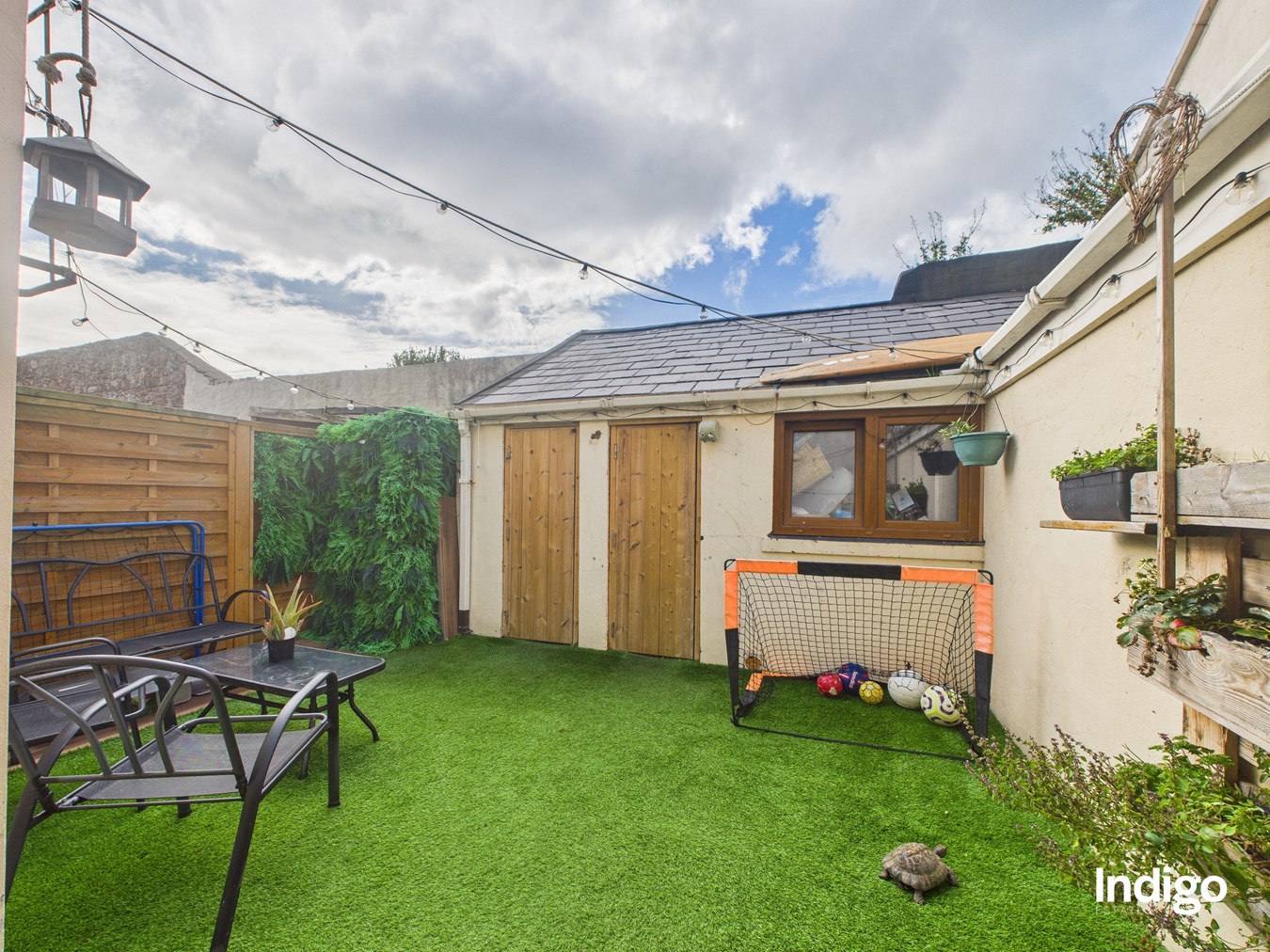 - Landscaped garden with two storage sheds