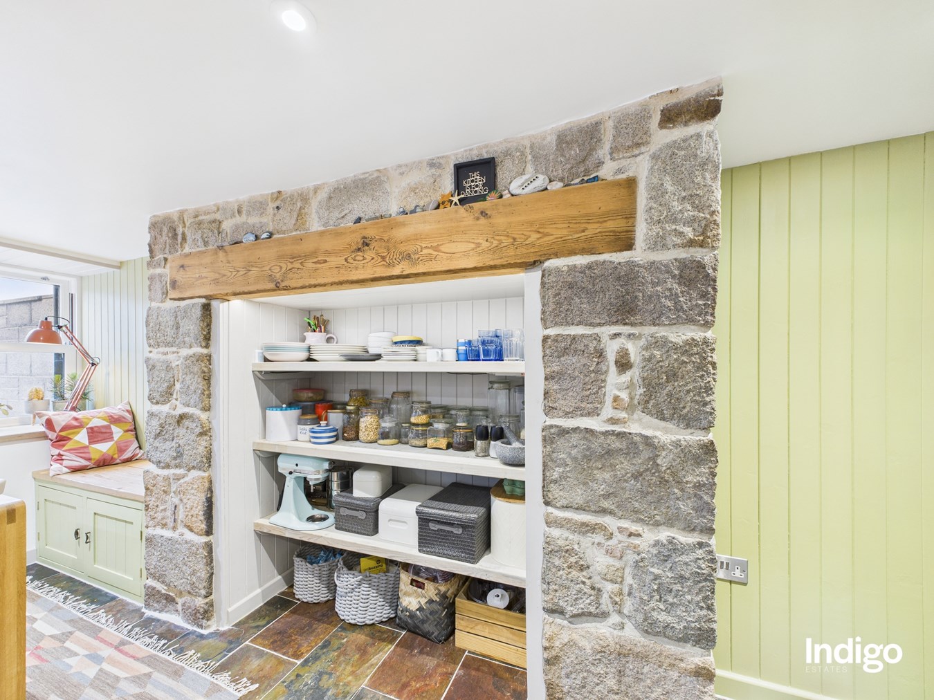 Inside, the home features three bedrooms, a study area, a stylish house bathroom, and a cloakroom incorporating a useful utility area. The cosy living room is a true highlight, boasting vaulted ceilings and exposed granite walls that create an unmistakably warm and rustic atmosphere. The fully integrated kitchen is equally impressive, complete with a centre island, formal dining area, additional storage, and a stunning exposed granite feature space, perfect for everyday living and entertaining alike.