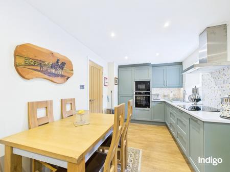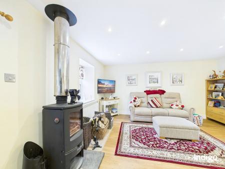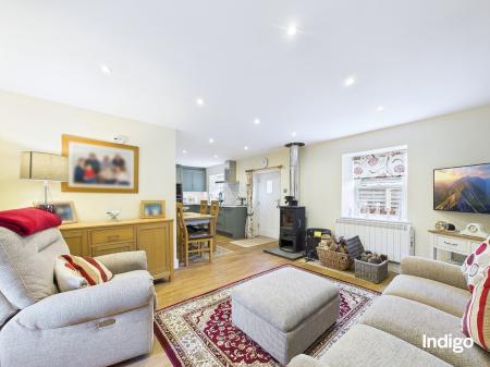 The accommodation comprises two bedrooms, a stylish house bathroom, and a convenient downstairs cloakroom. A separate utility room adds practicality, while the open-concept living area forms the heart of the home, featuring a cosy wood-burning stove, ample dining space, and a fully integrated modern kitchen, perfect for relaxed living and entertaining.