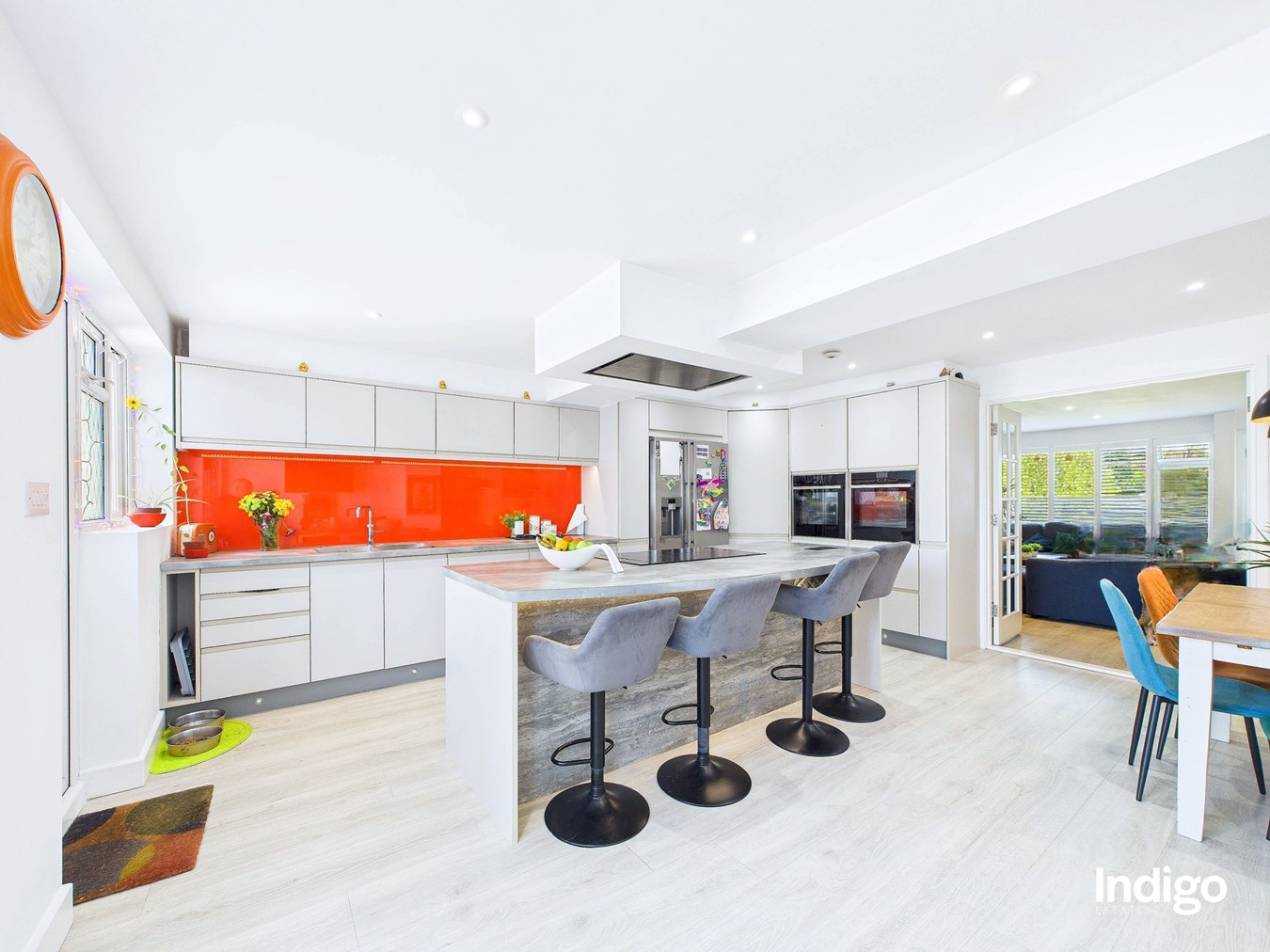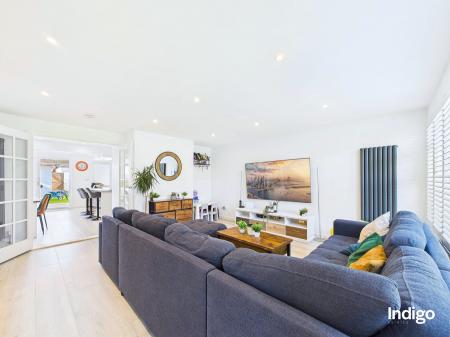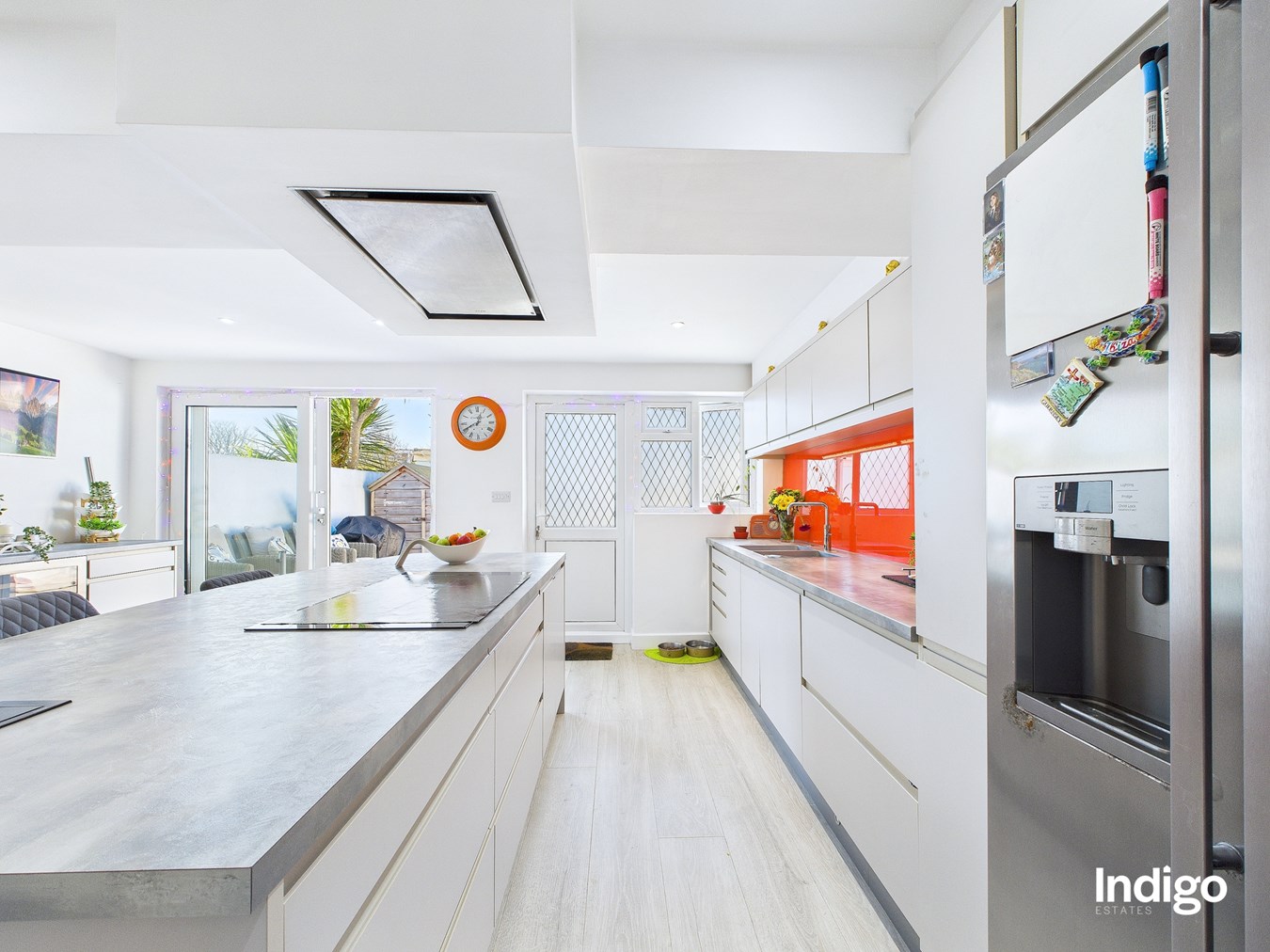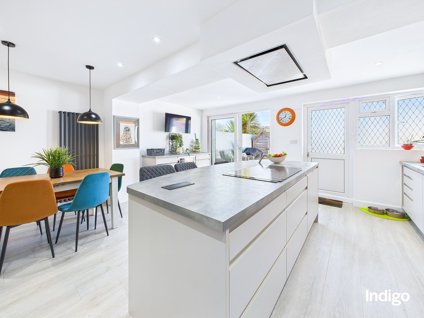 The property features three bedrooms and a stylish house bathroom, with a welcoming porch leading into a generous and cosy lounge. Double doors open through to a stunning open-concept kitchen and dining area, complete with a large centre island, breakfast bar seating, and space for formal dining, ideal for both everyday family life and entertaining. French doors lead directly out to the enclosed rear garden, extending the living space outdoors.