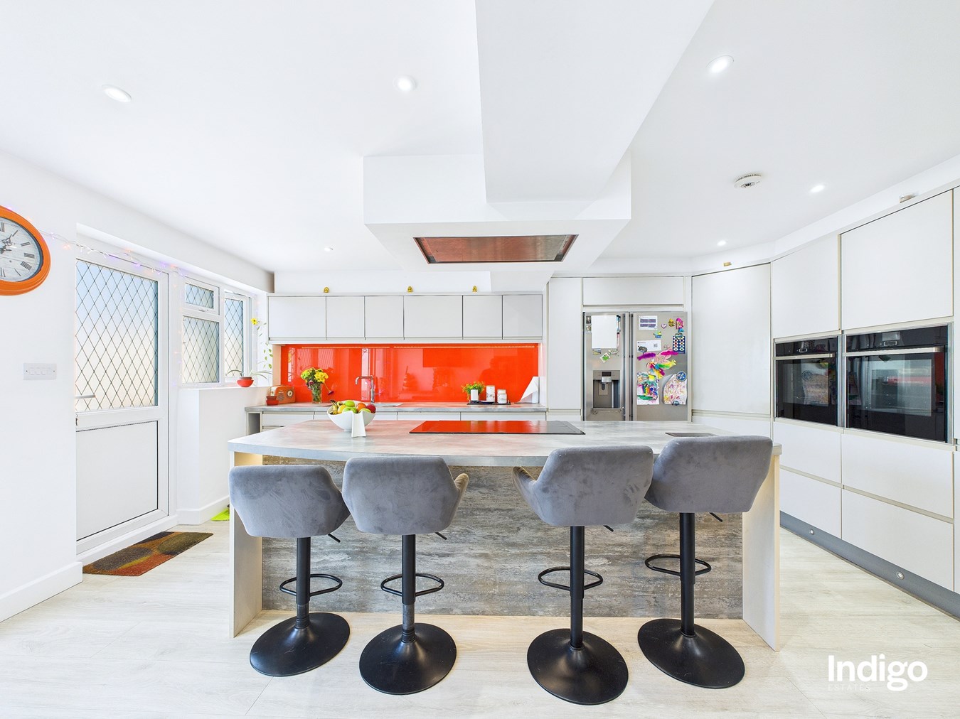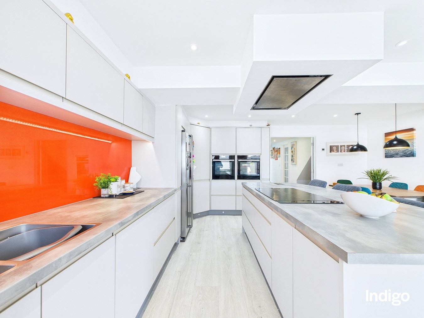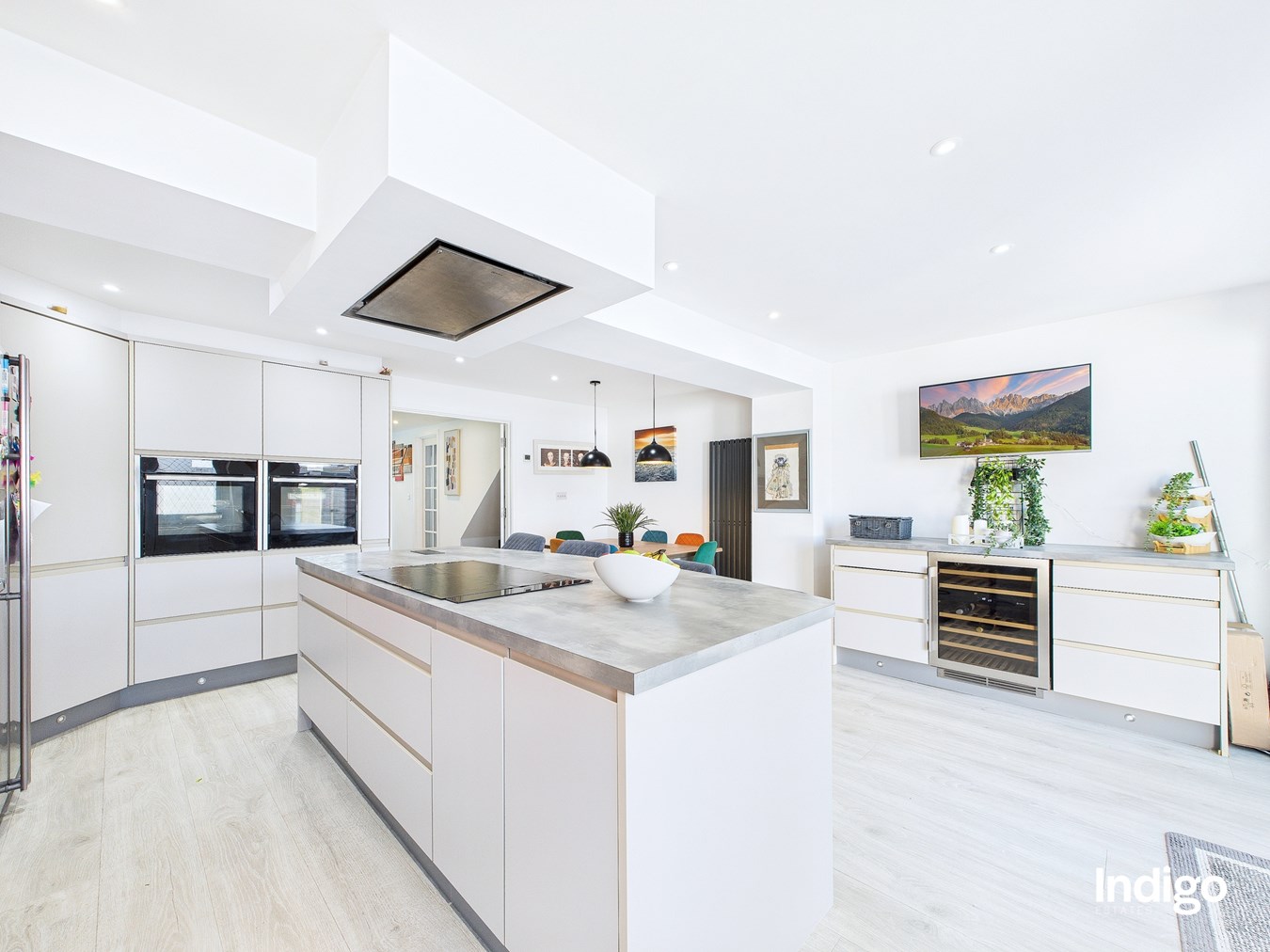 The property features three bedrooms and a stylish house bathroom, with a welcoming porch leading into a generous and cosy lounge. Double doors open through to a stunning open-concept kitchen and dining area, complete with a large centre island, breakfast bar seating, and space for formal dining, ideal for both everyday family life and entertaining. French doors lead directly out to the enclosed rear garden, extending the living space outdoors.