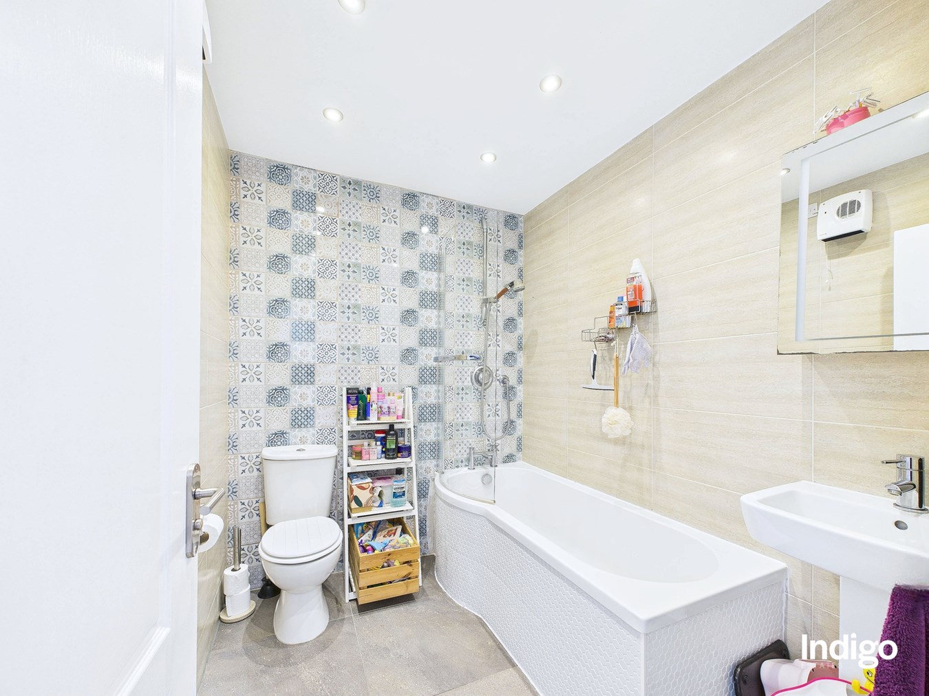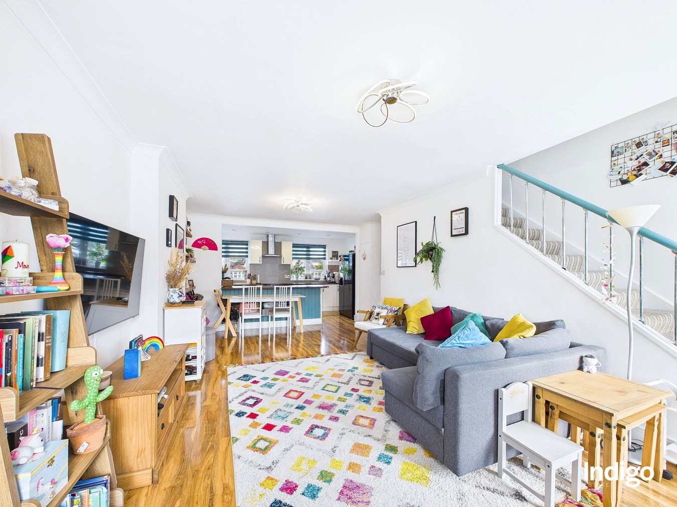 The property offers two generous double bedrooms and a contemporary house bathroom, alongside a bright open-concept living space with ample room for dining and entertaining. The modern fitted kitchen includes a breakfast bar area, creating a sociable hub within the home, while the living area opens onto a dedicated balcony laid with artificial lawn, perfect for relaxed outdoor living.