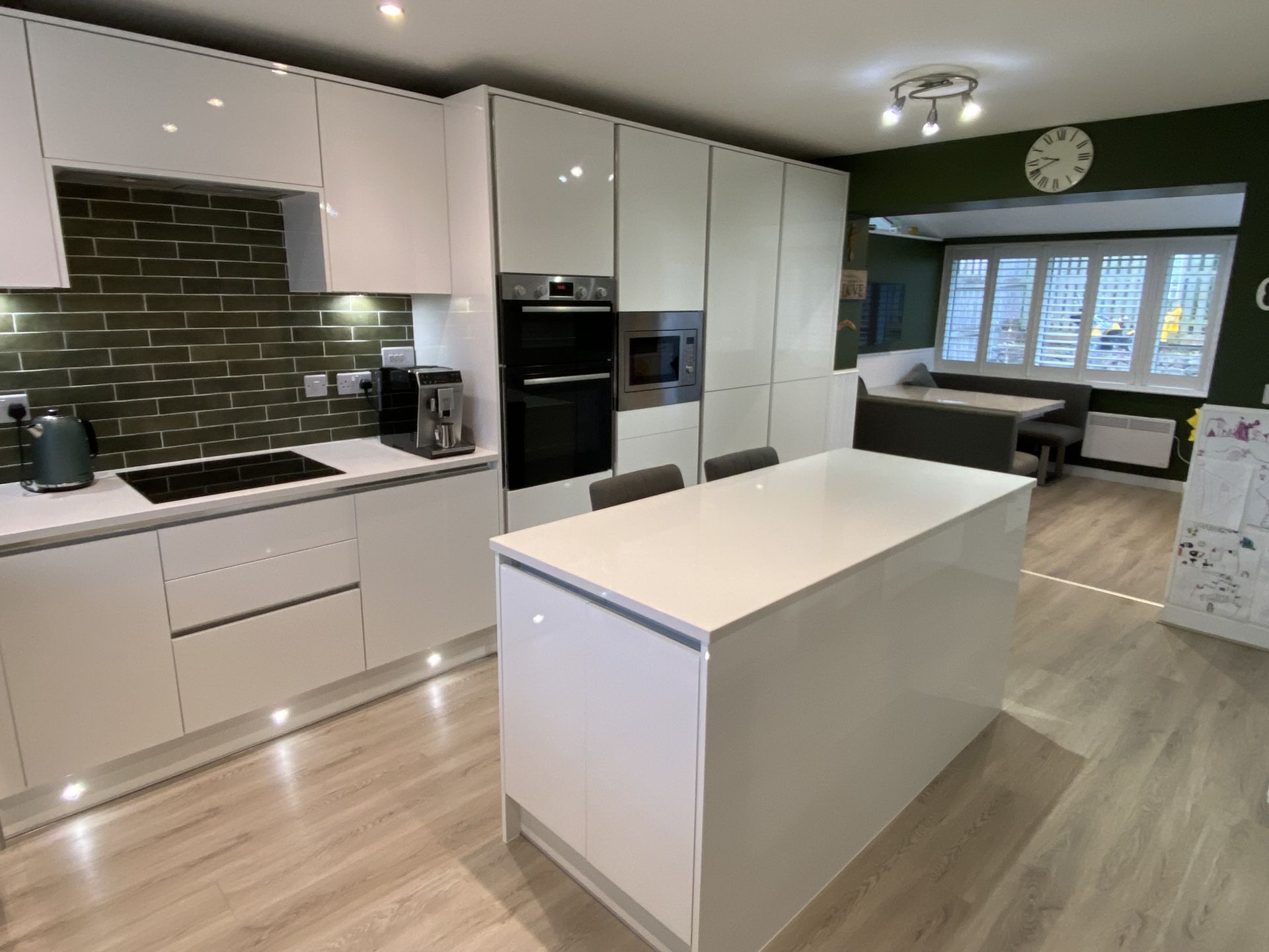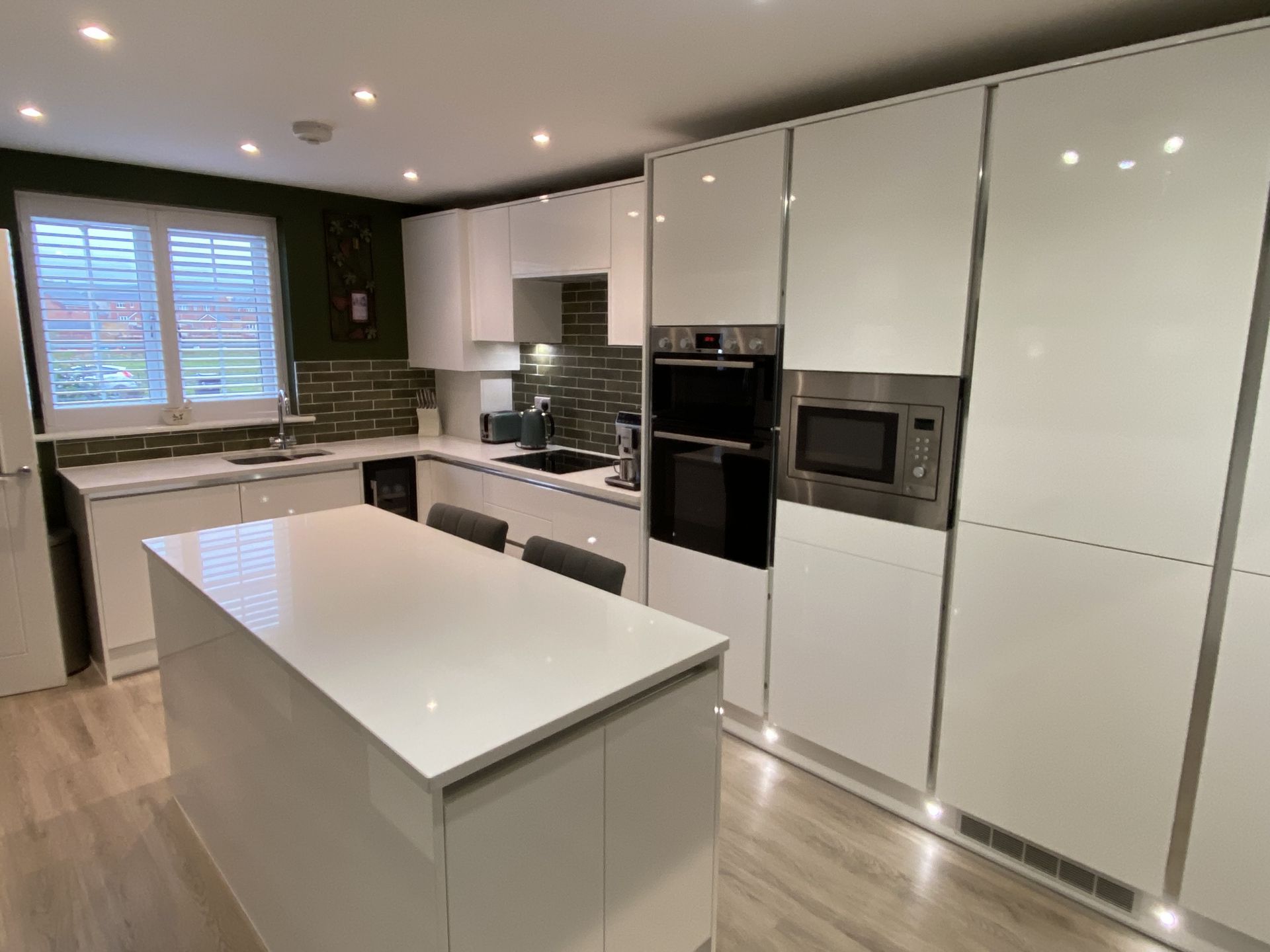 The beautifully appointed kitchen is fitted with an extensive range of modern wall and base units and benefits from a central island, offering excellent preparation and storage space. Integrated appliances include an electric eye-level double oven, microwave, hob and fridge freezer. A useful utility area has been cleverly incorporated into the cupboard beneath the stairs, providing practical additional space. An archway opens into the extended dining area, which features patio doors leading directly to the rear garden, creating a seamless connection between indoor and outdoor living.