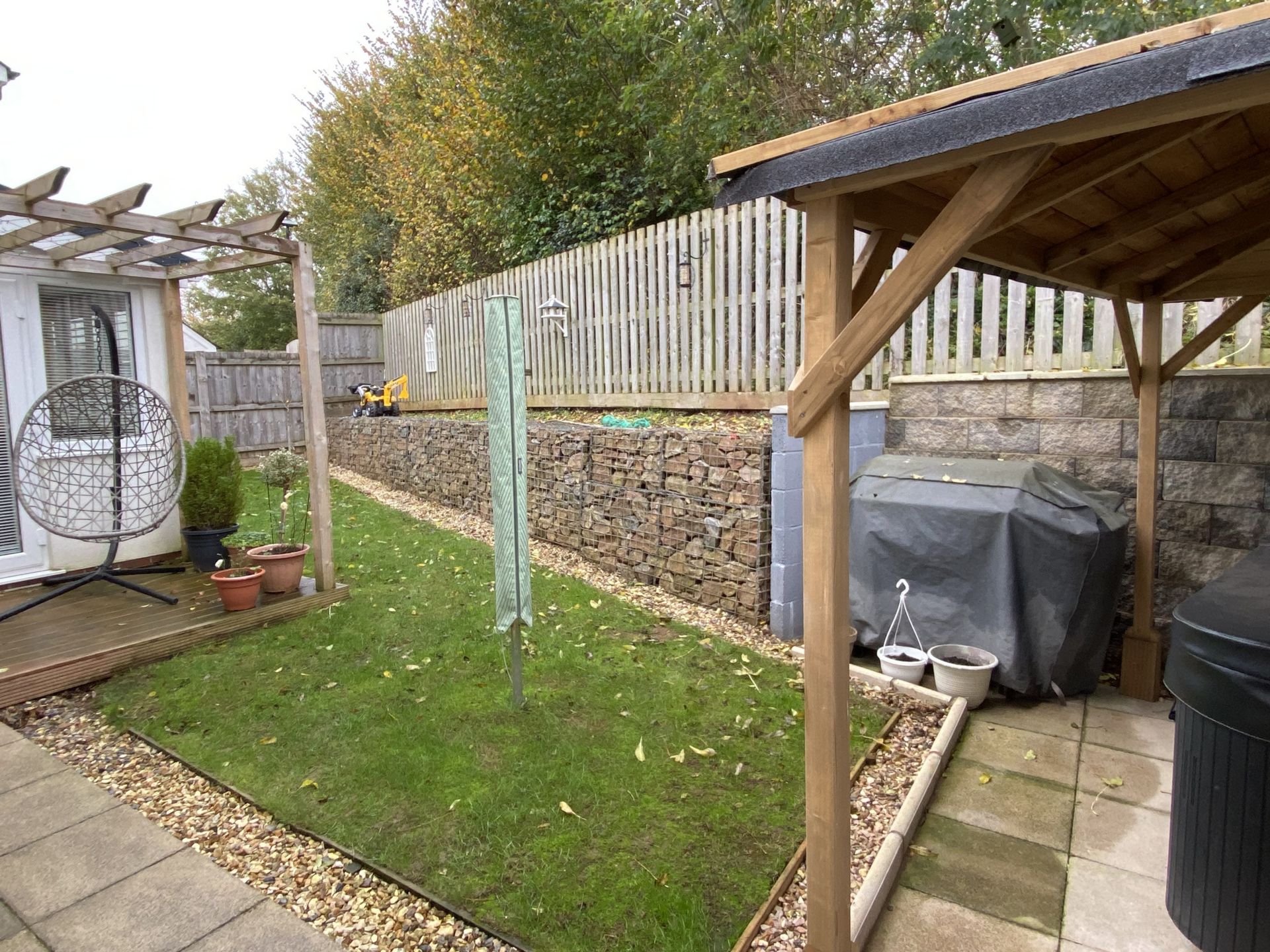 The rear garden is designed for ease of maintenance and enjoys a high degree of seclusion, making it an ideal space for relaxation and outdoor dining. A paved patio sits beneath a pergola, creating an attractive, shaded area perfect for seating or entertaining. There is also a decked seating area offering an additional spot to enjoy the garden, along with a small area of lawn providing greenery with minimal upkeep.
