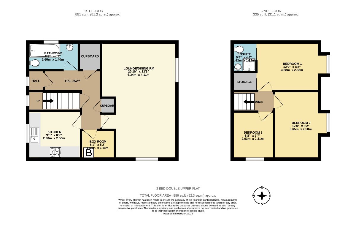 Covered rear porch leads to NEW front door into bright and airy stairwell up to first floor. Welcoming hallway with box room and two additional storage cupboards. To front is a bright, spacious lounge/dining room with dual aspect. The fitted kitchen boasts ample storage and space for free-standing appliances. The NEW bathroom provides a suite of bath with mains shower over, washbasin and WC with stylish wet wall surround. Stairs to second floor. There are three good-sized bedrooms with Bedroom 1 providing an en-suite shower room and additional storage. The property benefits from gas central heating and double glazing. Externally there is a drying area/garden shared with ground floor flat. There is open resident's parking.