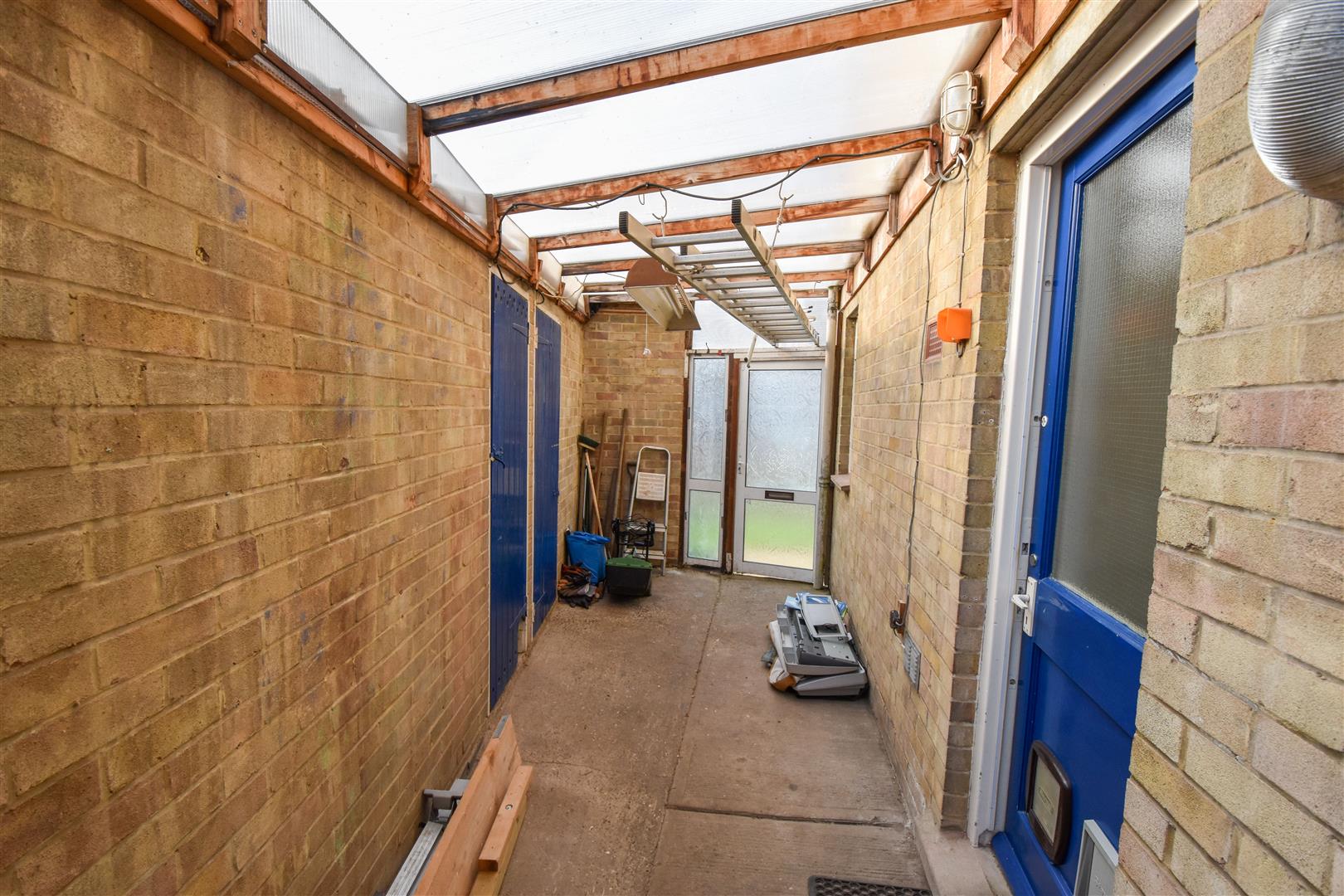Covered Lean-To - Access from the front garden. Door into the rear garden and into two storage rooms.