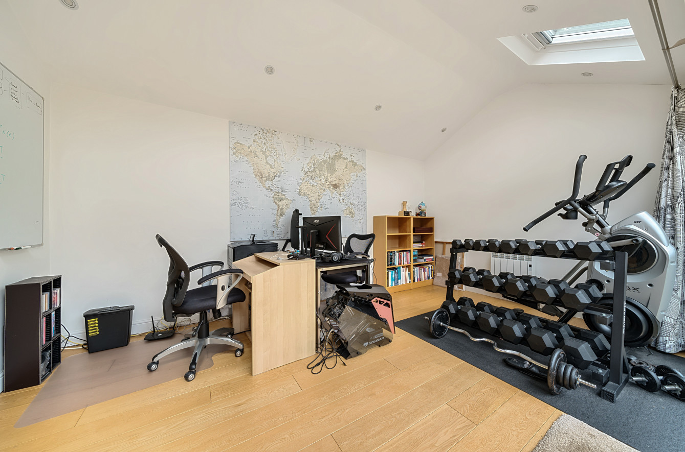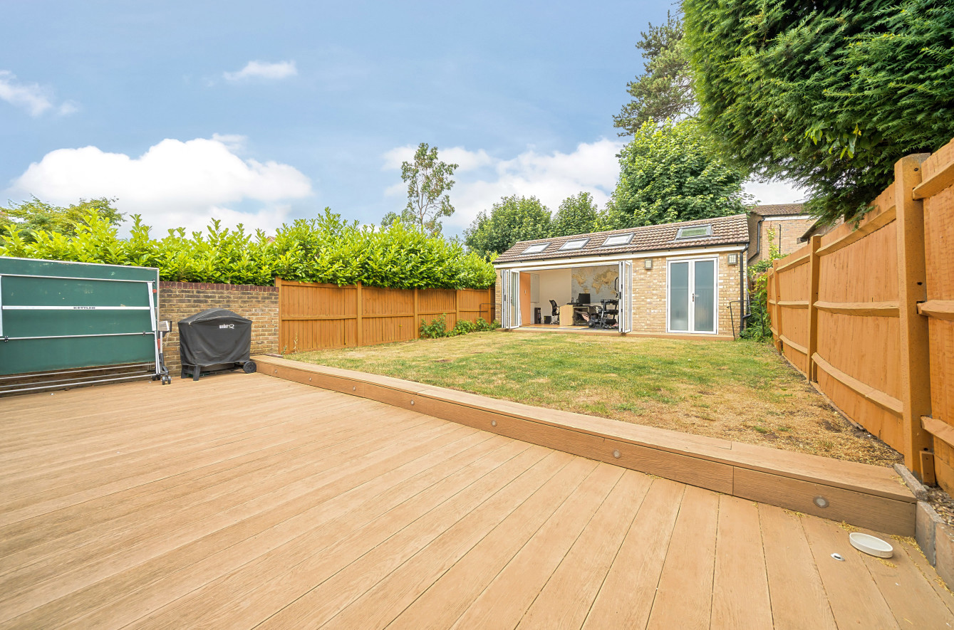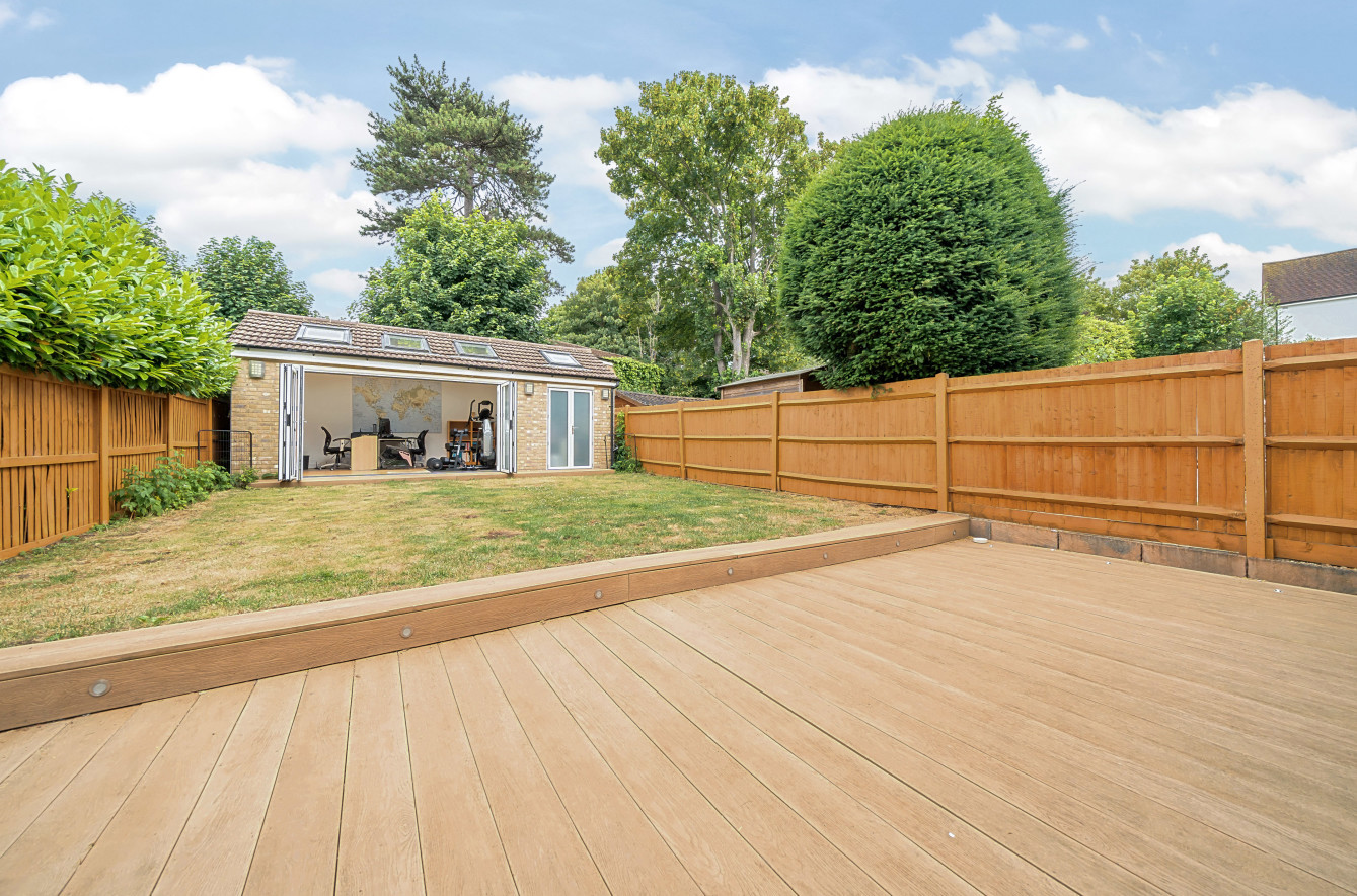 The outdoor space of this property is equally impressive. The garden is generously sized and features a combination of decking and grass, providing a tranquil setting for relaxation or outdoor activities. An added bonus is the presence of an outside office/gym, offering a versatile space that can be used for work, fitness, or hobbies. Privacy is ensured with a large private driveway, providing parking for two vehicles.