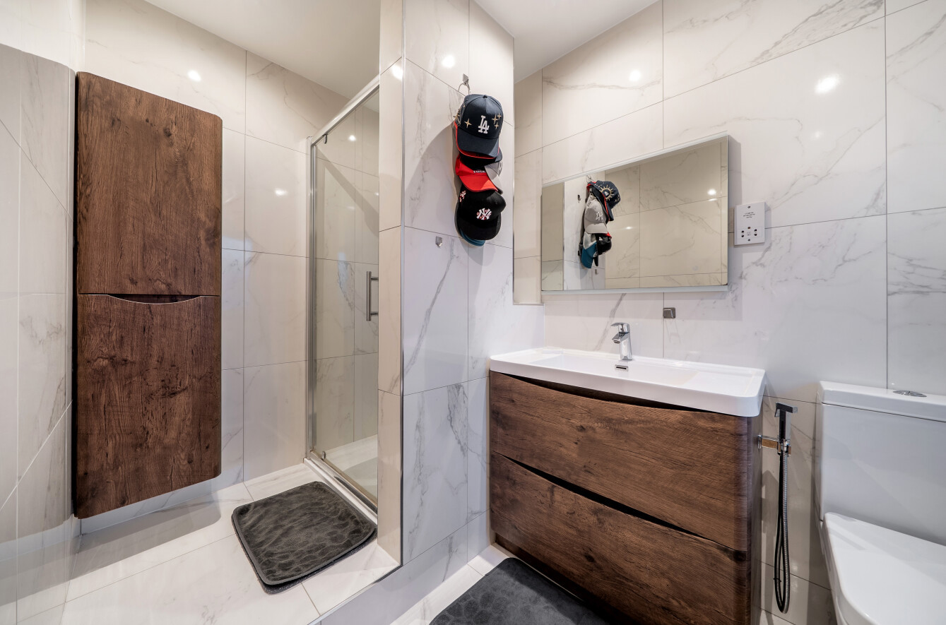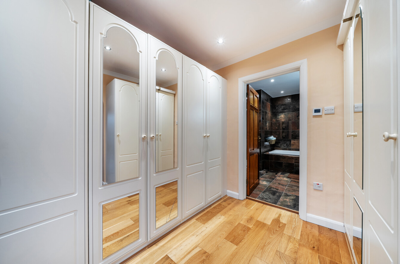 To the first floor are four double bedrooms. The large dual-aspect principal bedroom suite extends to approximately 280 sq ft and is complemented by a fitted dressing room and luxury en suite bathroom, featuring stunning tiling, twin basins set within a vanity unit, a bath and a separate shower cubicle.