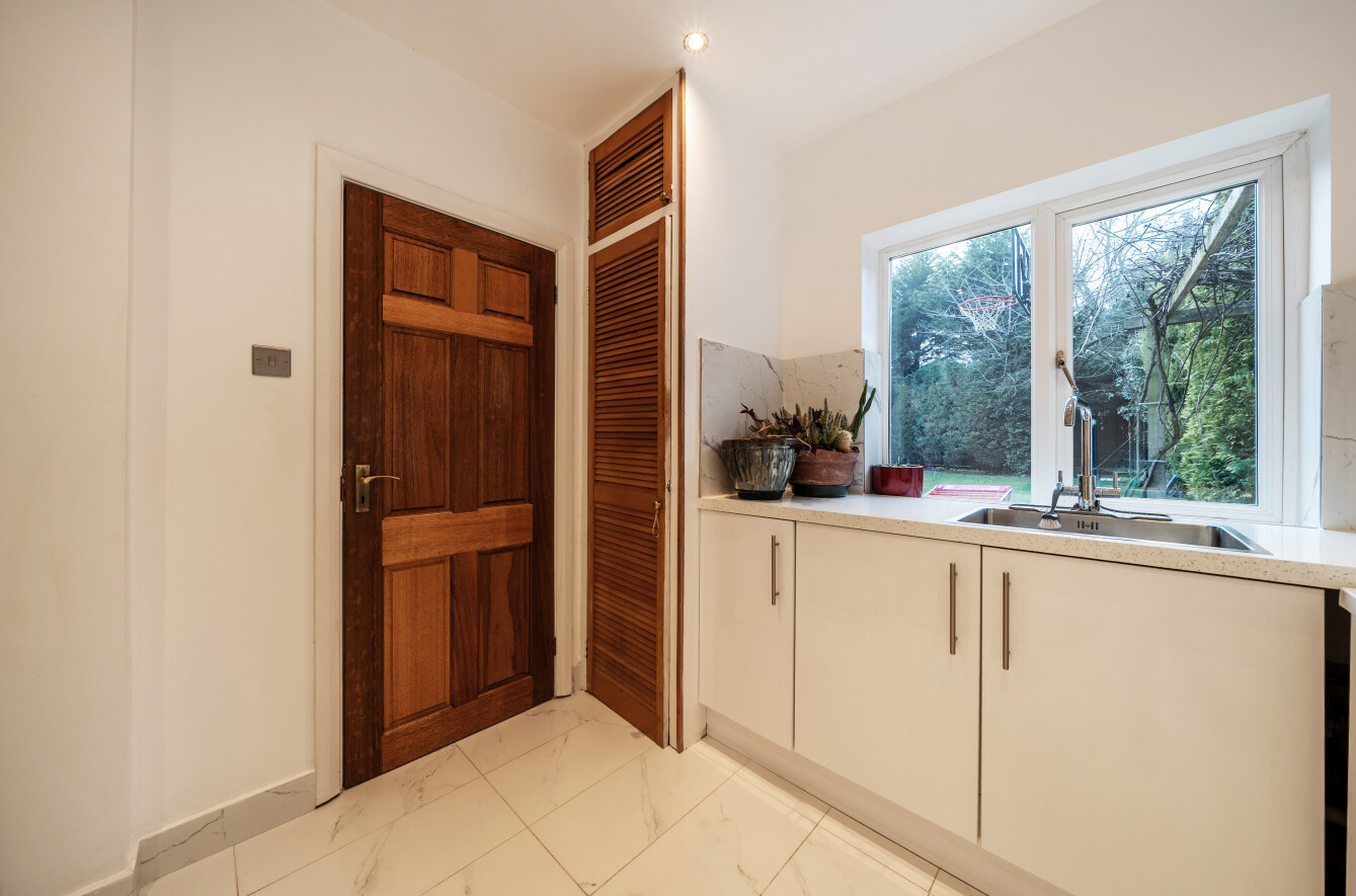 The kitchen/breakfast room showcases a comprehensive range of Shaker-style floor, wall and full-height cabinetry in a striking deep green finish. A classic butler sink and white marbled quartz work surfaces are standout features, and there is ample space for casual dining. A separate fitted utility room provides a door to the side of the house and access to two additional rooms, offering considerable flexibility of use for the purchaser.