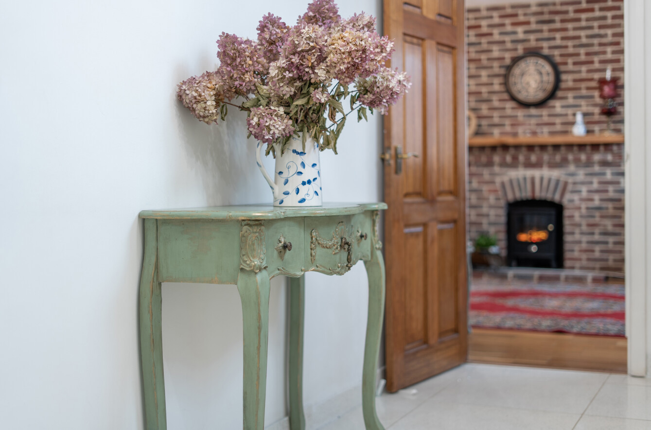 Entry to the property is via a covered porch into a spacious hallway, where large-format floor tiles (which continue through to the kitchen) create a clean, smart presentation, complemented by the warmth of wooden stairs. A guest cloakroom is accessed from here and there is also a useful understairs cupboard.