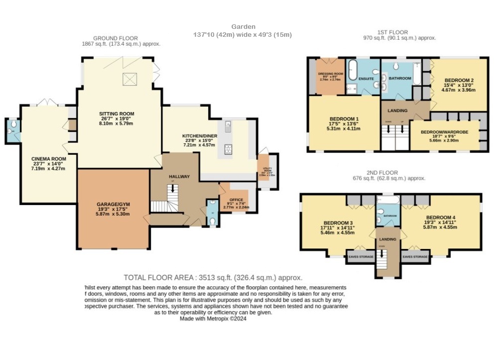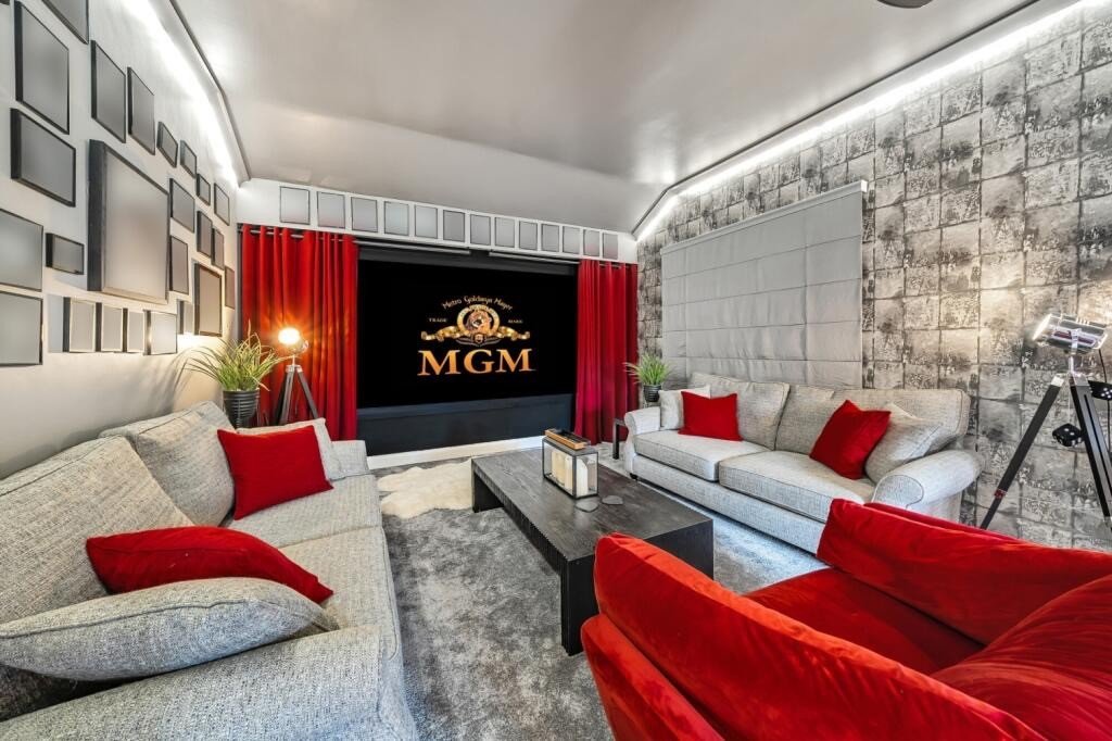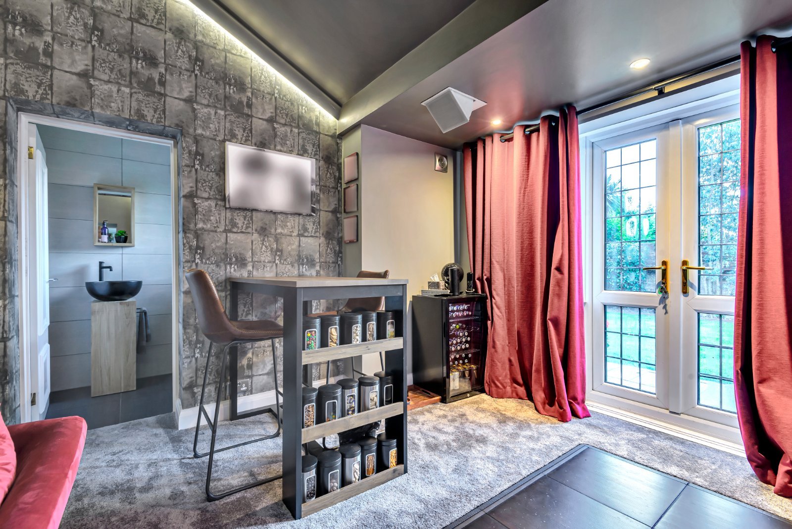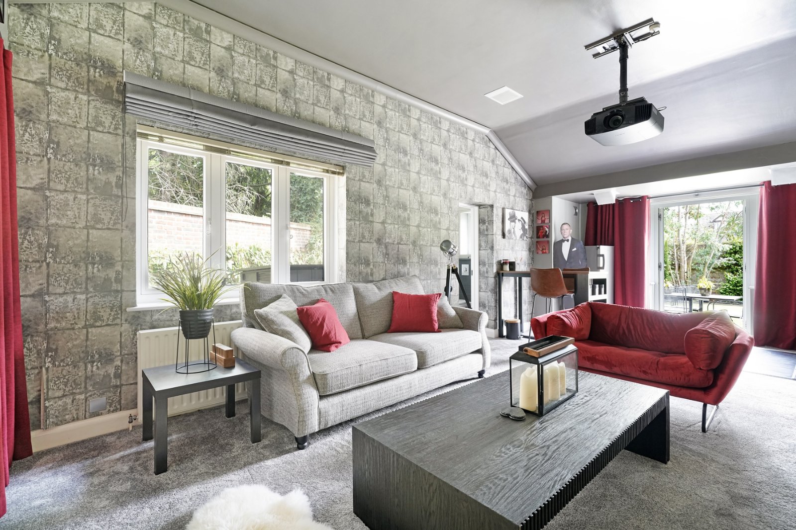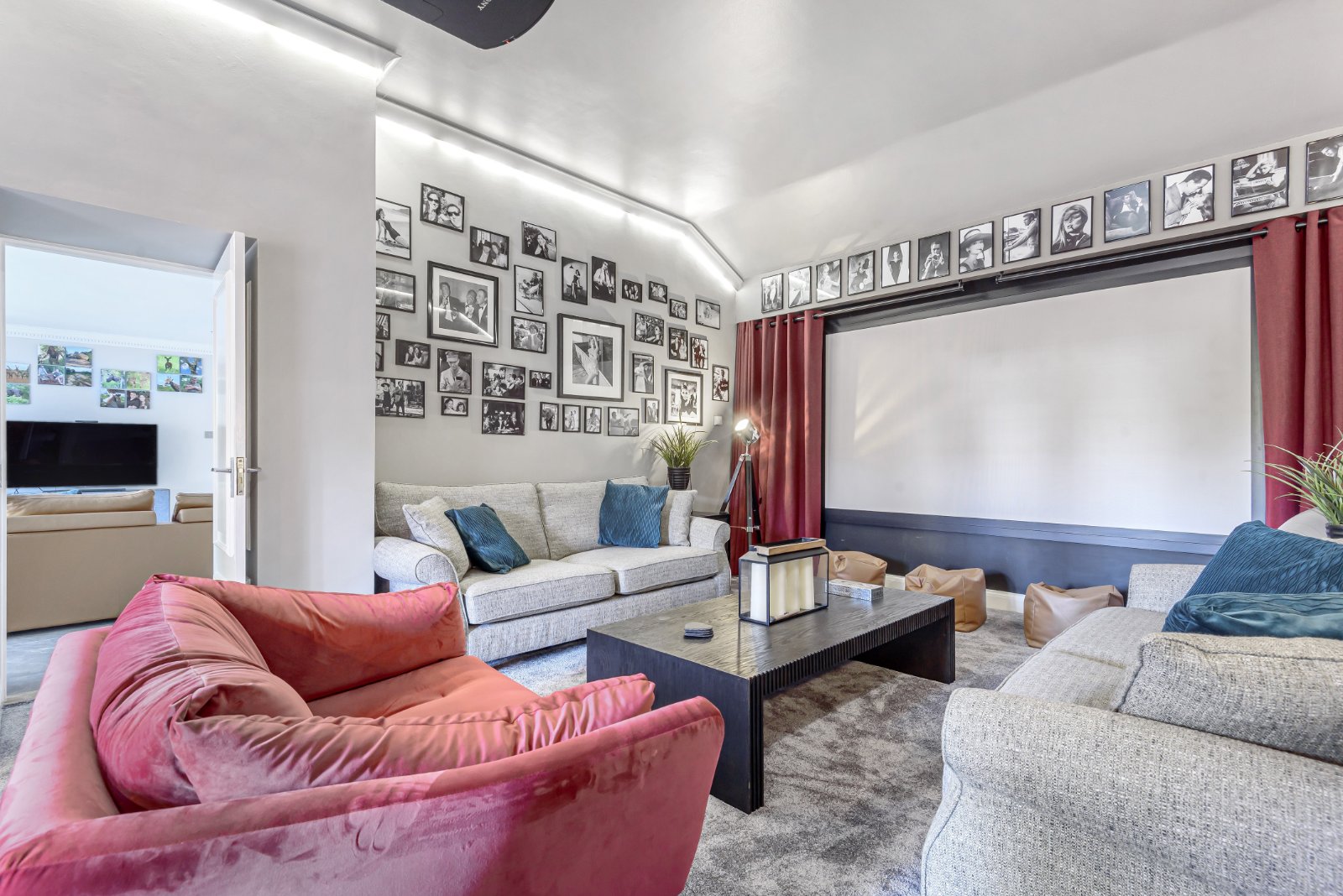 The cinema room is another standout feature, designed for complete family enjoyment, and is equipped with projection equipment and a full cinema screen. A conveniently located cloakroom serves this area, while double doors also provide direct access to the garden.