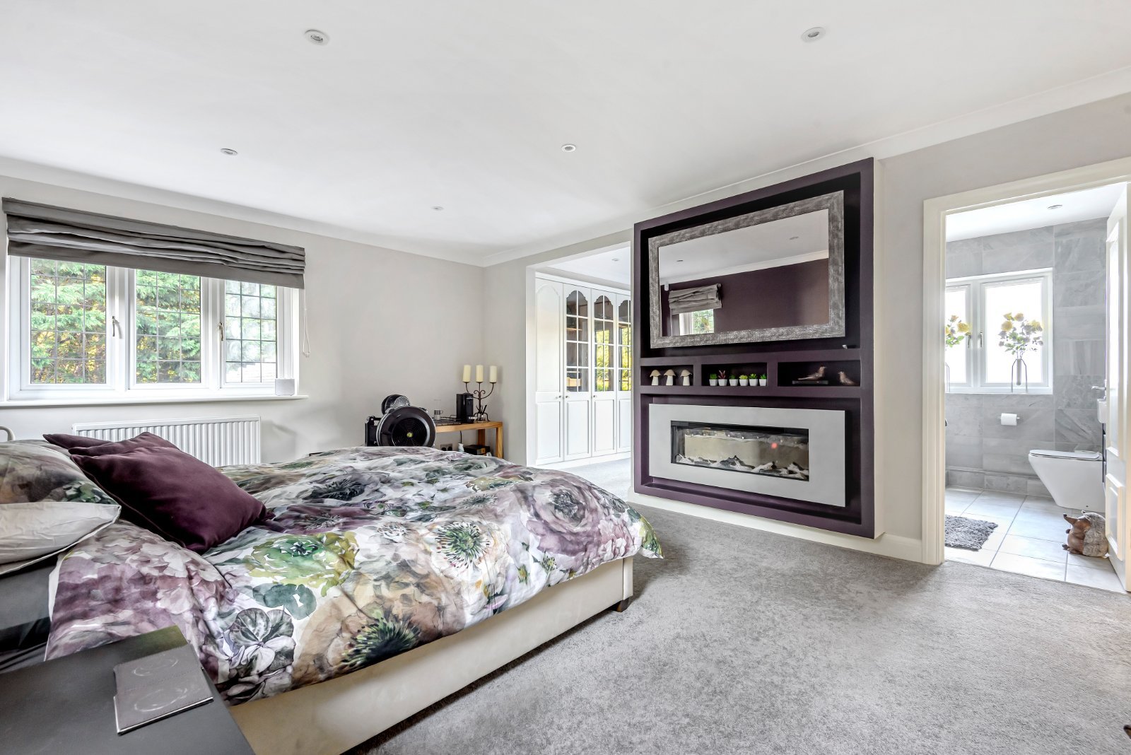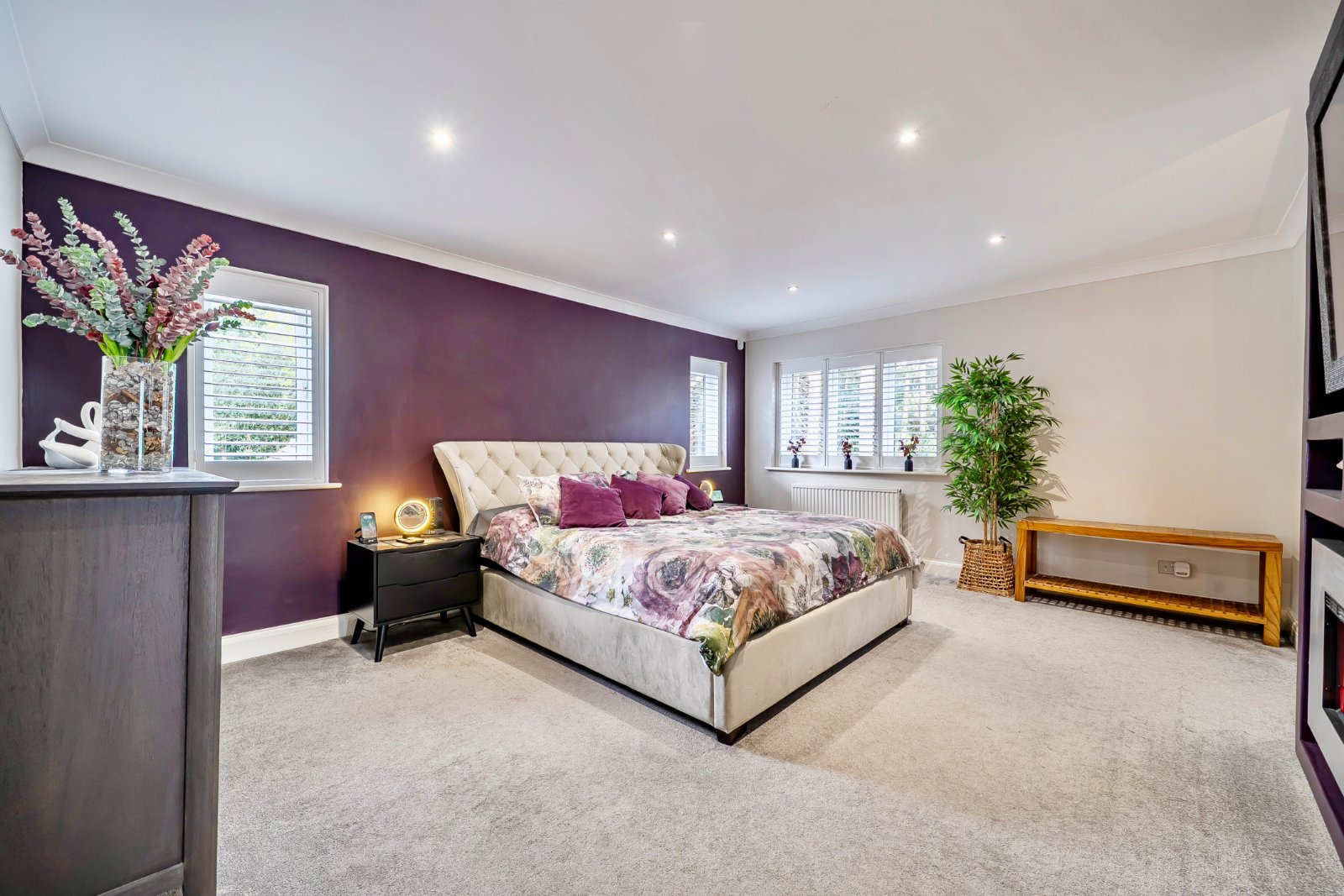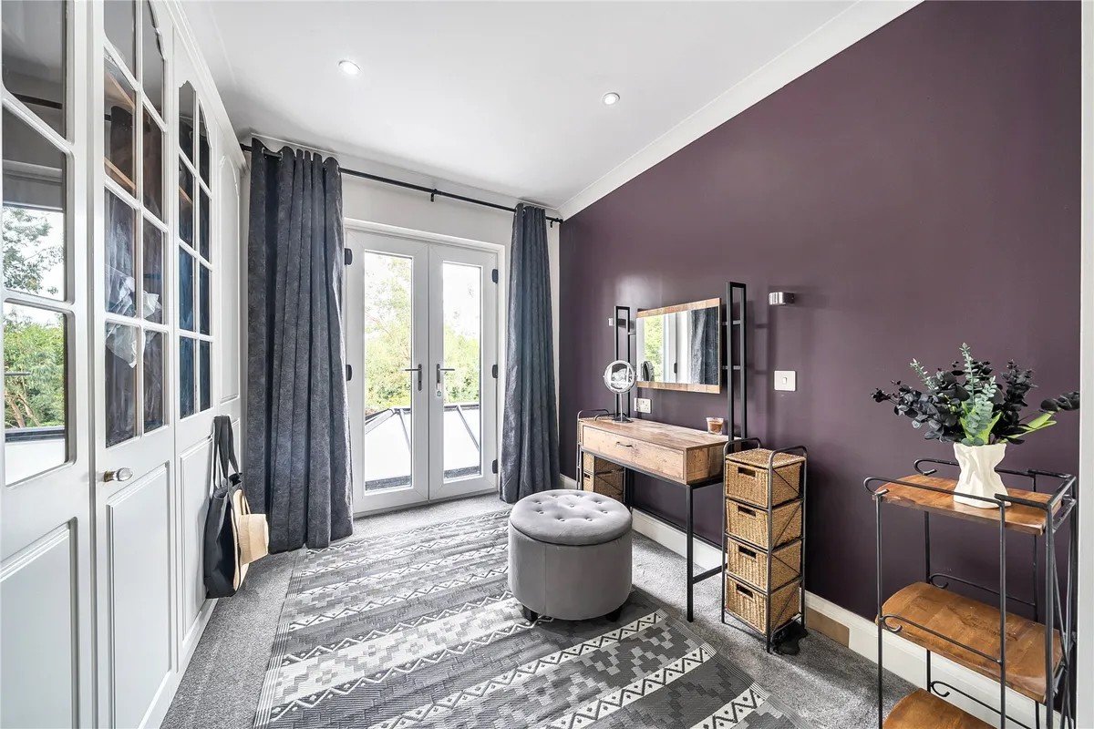 To the first floor, the principal bedroom suite features a stylish plum-painted feature wall with a coordinating built-in display unit, along with a feature electric ‘hole in the wall’ fireplace. The adjoining dressing room is fitted with a full wall of beautiful wardrobes, and a Juliet balcony overlooks the rear garden. The luxurious, fully tiled en suite comprises an oval low-profile freestanding bathtub, a shower cubicle, and a basin set into a drawer storage unit. A window provides natural light and ventilation.