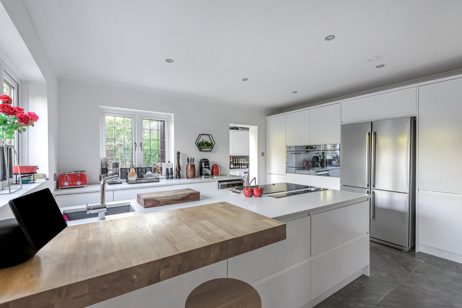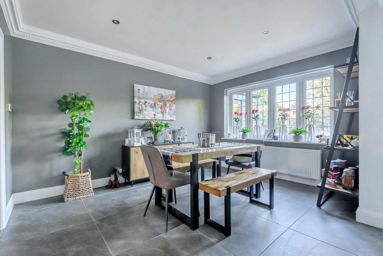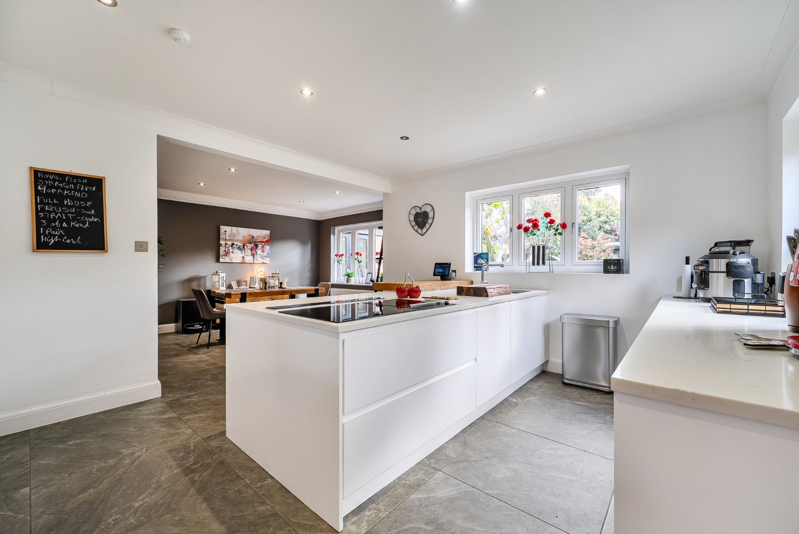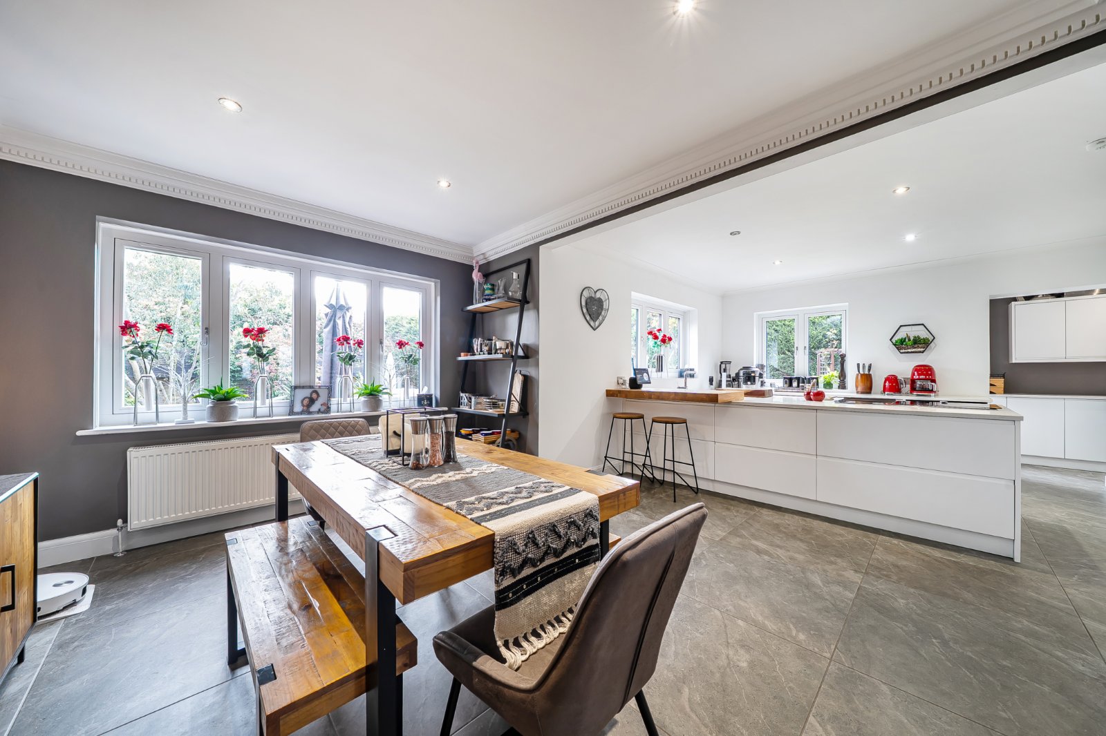 The kitchen/diner is a superb, bright, and open space, ideal for both everyday living and entertaining. The kitchen is fitted with a comprehensive range of sleek, contemporary handleless cabinets, including floor and full-height units, all complemented by a coordinating quartz work surface and a wood block breakfast bar. A separate utility room provides additional practicality, with fitted units and direct access to the outside. The dining area is generously proportioned, offering ample space for a full dining suite, with views over the rear garden. Deep painted walls subtly define the space, adding warmth and character.