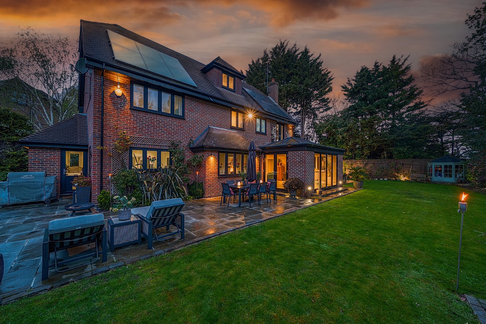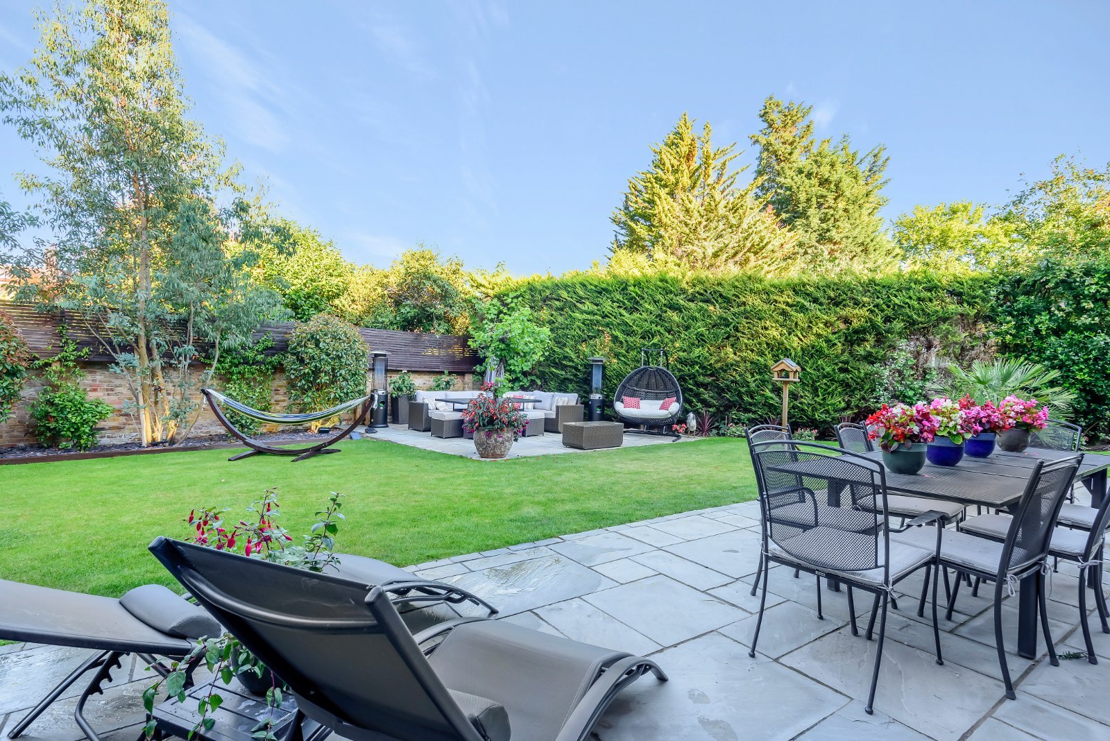 The 137’ wide garden features a patio spanning the full width of the house, ideal for outdoor dining and entertaining. The garden is beautifully arranged with tall mature hedging, well-stocked planted beds, and a large expanse of lawn. A further patio area provides additional space to relax and enjoy this attractive and private setting.