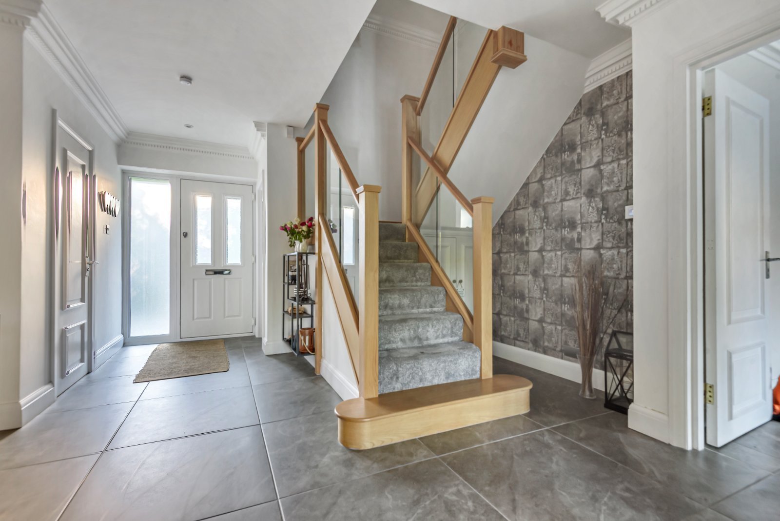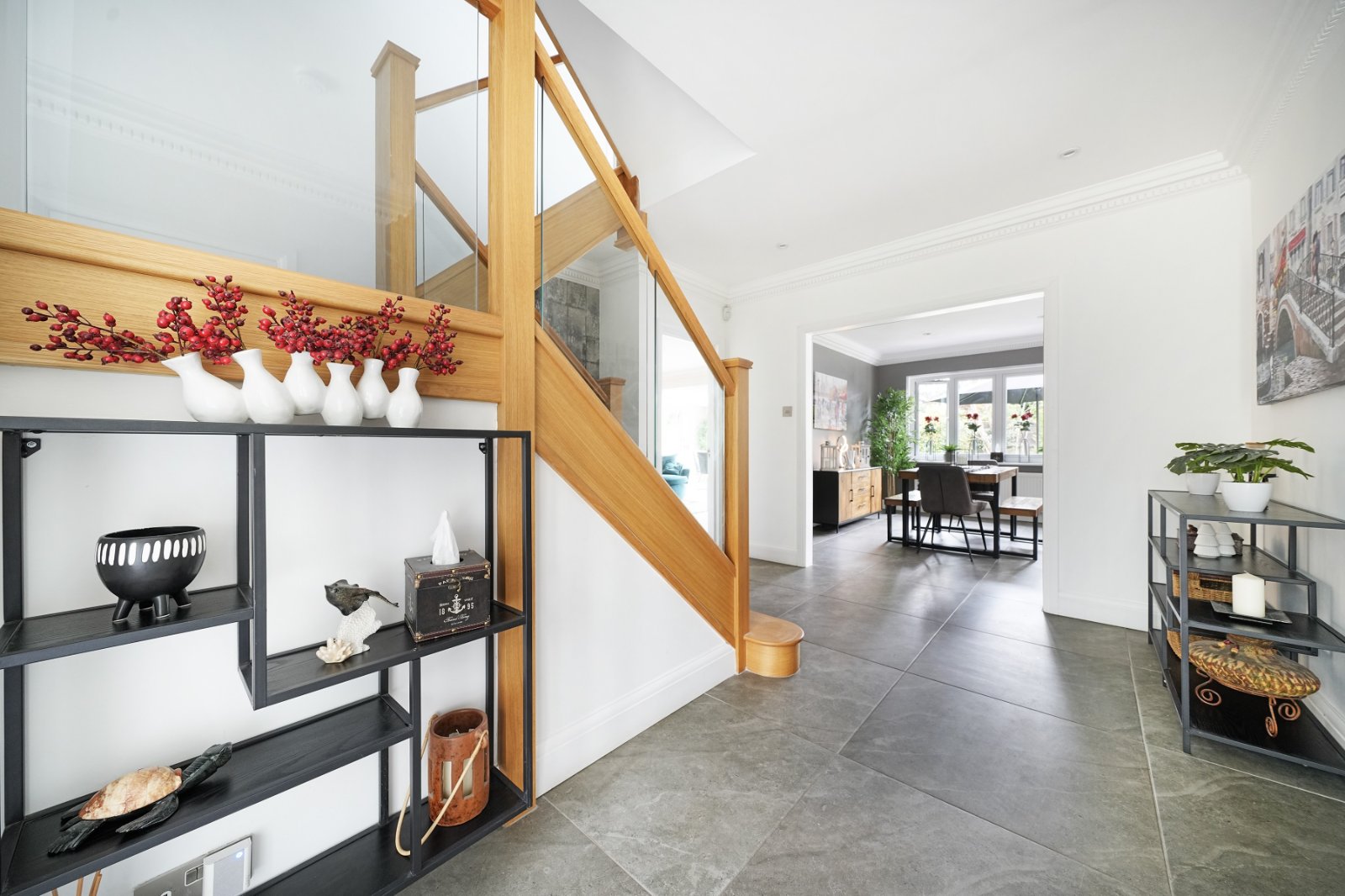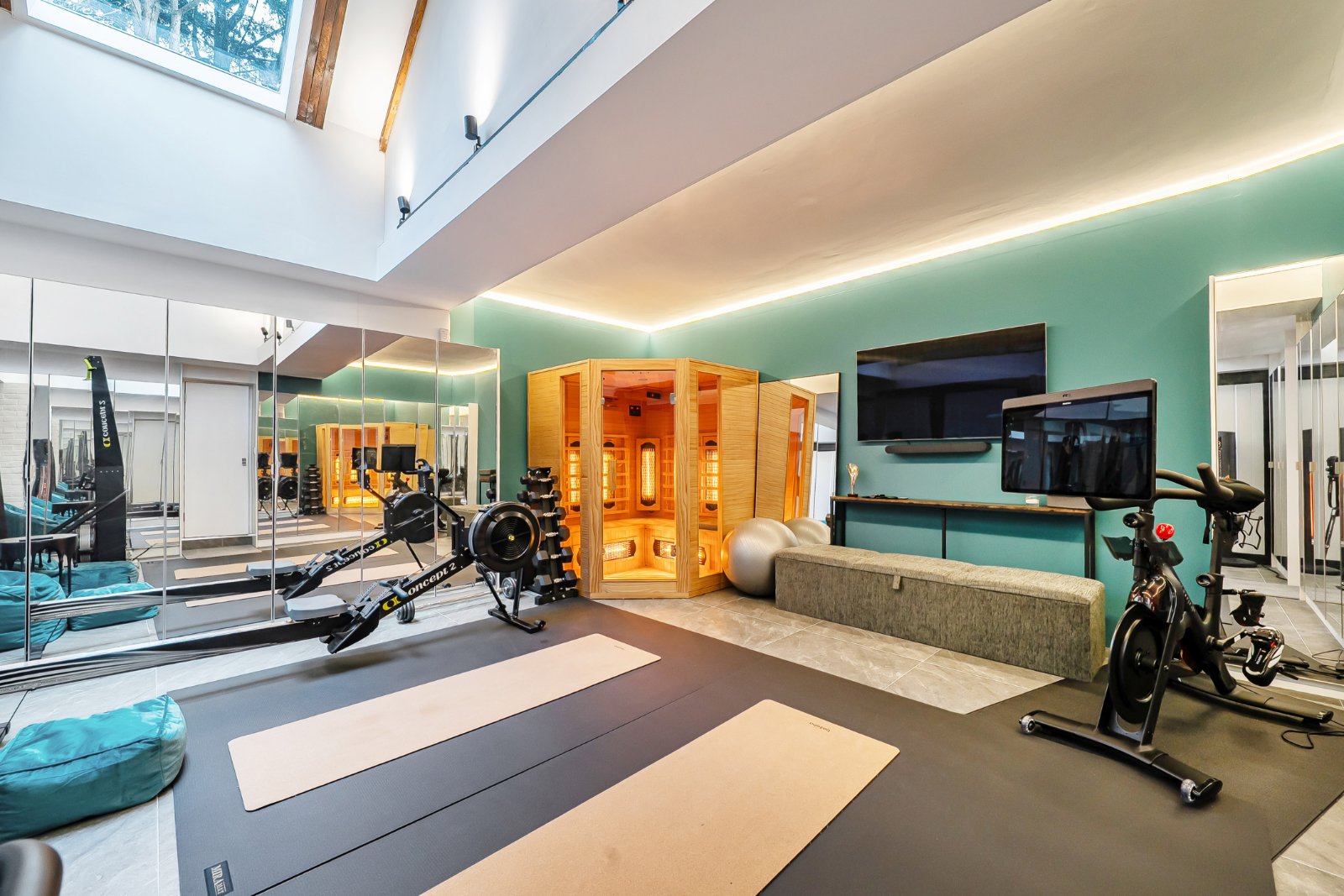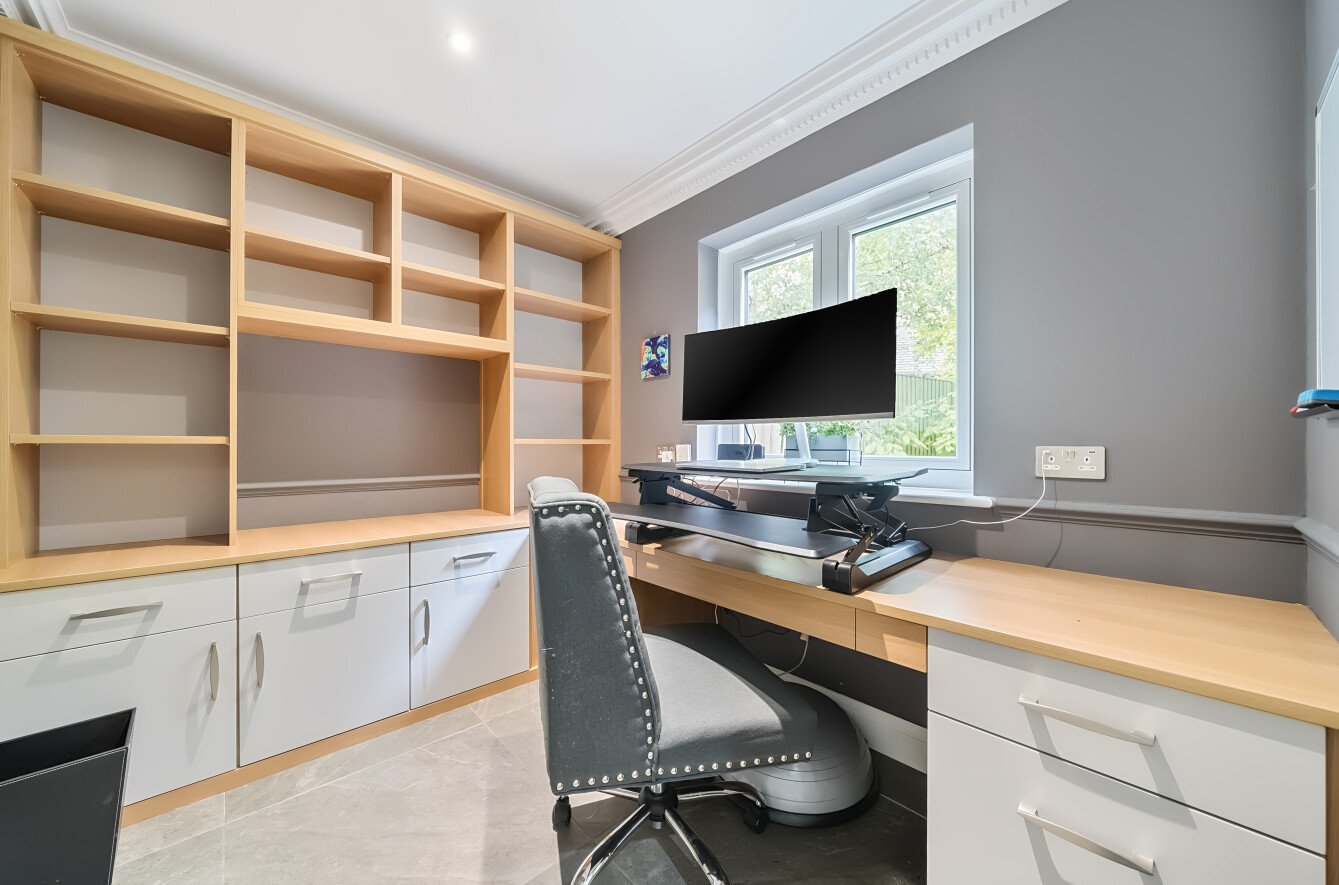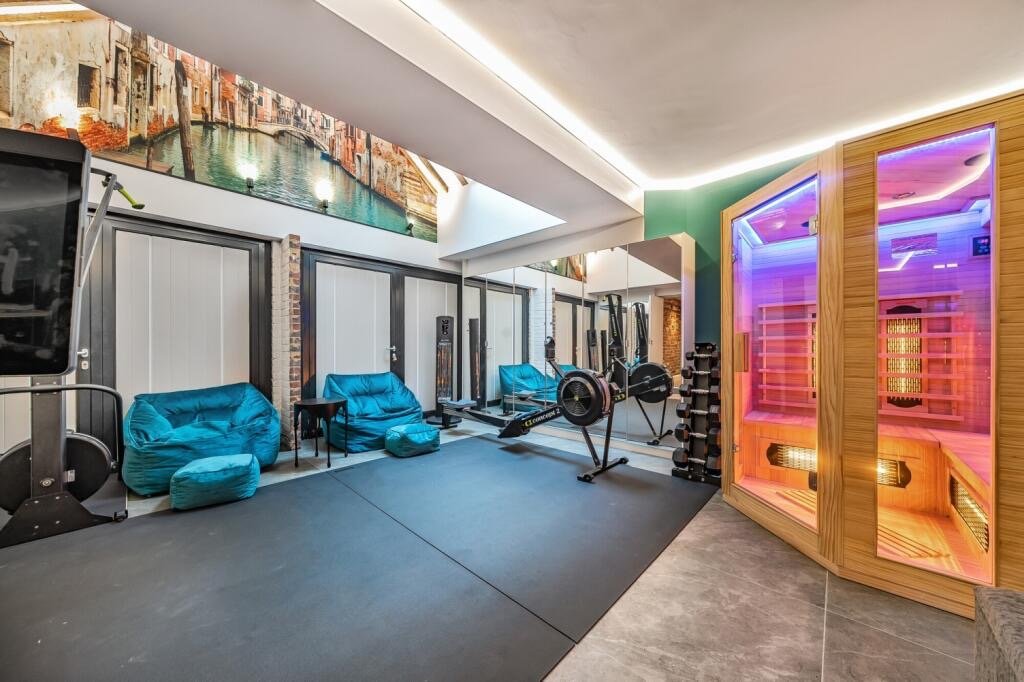 Upon entering the house, you are welcomed by an impressive reception hall featuring a striking oak and glass staircase, complemented by deep decorative cornicing and large-format floor tiles, which add to the sense of quality and finish. From here, there is access to a guest cloakroom, a substantial 335 sq ft gym, and a front-facing office. The office is exceptionally well appointed, with fitted cupboards, shelving, and a built-in desk. The remarkable gym is flooded with natural light from a rooflight and features a decorative mural, mirrored wall, soft flooring, and a sauna pod, creating a superb wellness space.