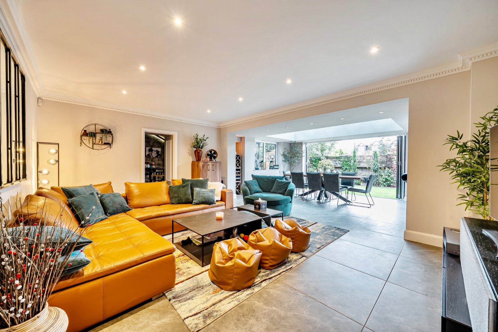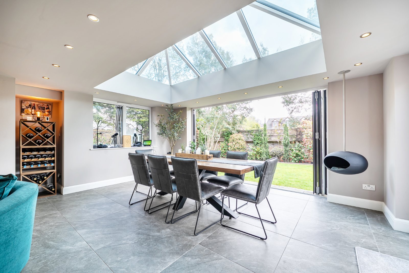An expansive 505 sq ft sitting room is positioned to the rear, offering a substantial lounge area along with additional space for dining. A large lantern rooflight floods the room with natural light, complemented by bi-fold doors that open directly onto the garden, creating a seamless indoor-outdoor flow,ideal for both everyday living and entertaining.