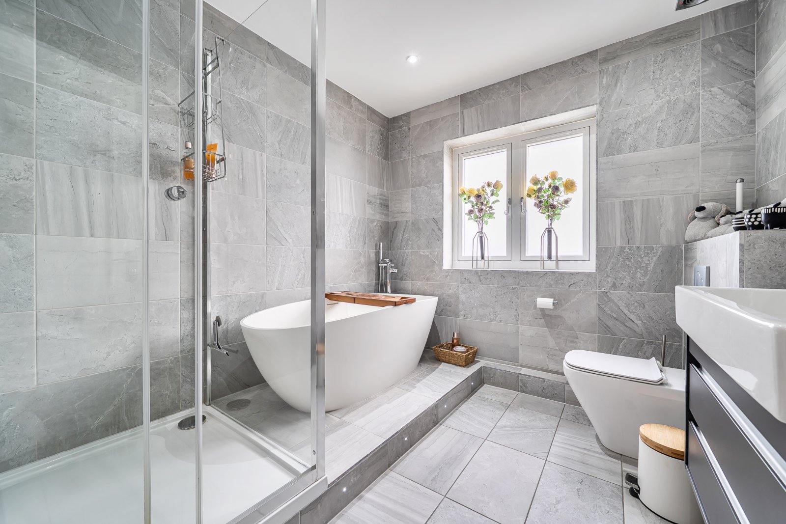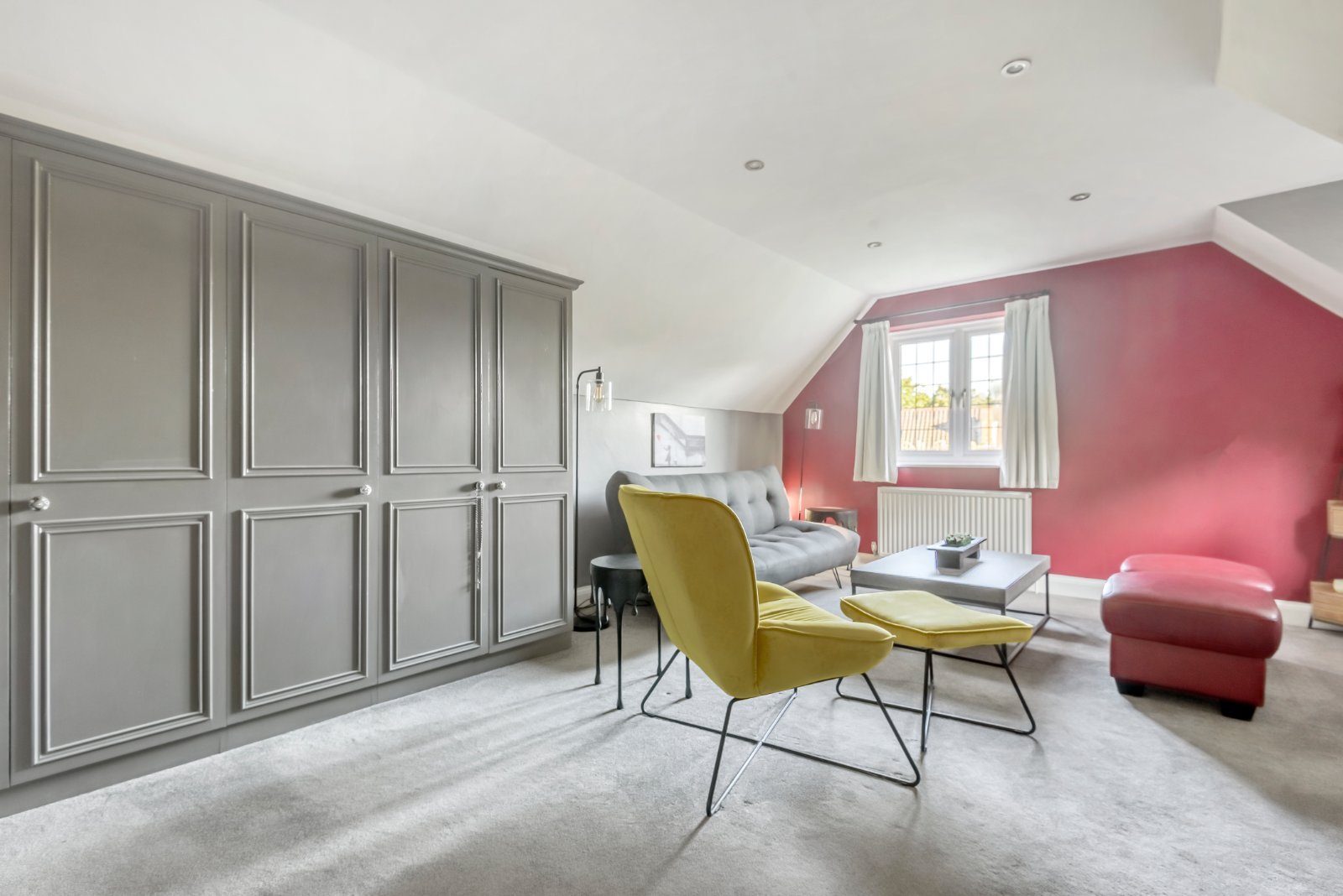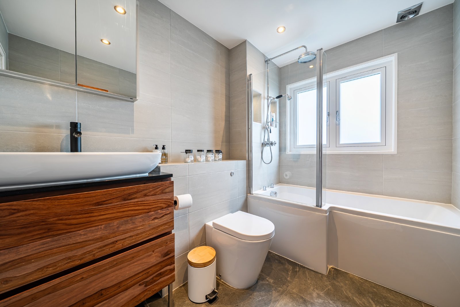 The final two bedrooms are located on the second floor. Both are generously sized doubles and benefit from floor-to-ceiling built-in wardrobes, as well as useful eaves storage. A central bathroom serves both rooms and features a P-shaped bath with an overhead shower. The wash basin is set into an attractive drawer storage unit, providing both style and practicality.