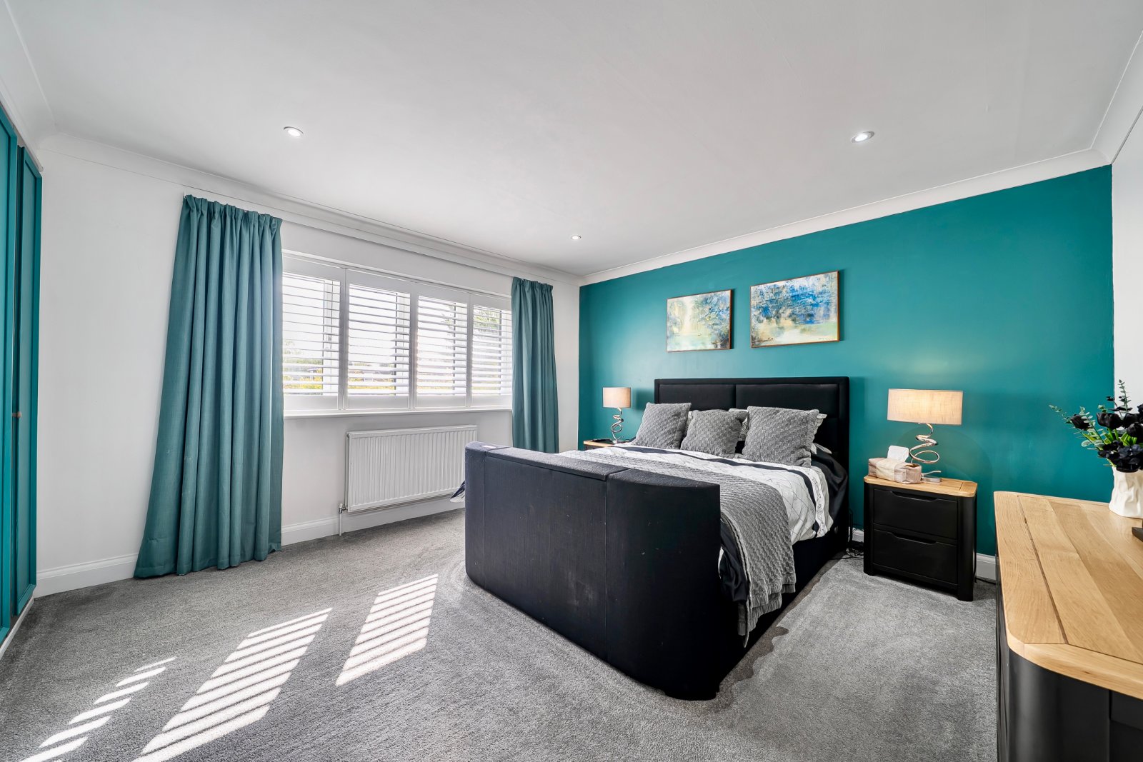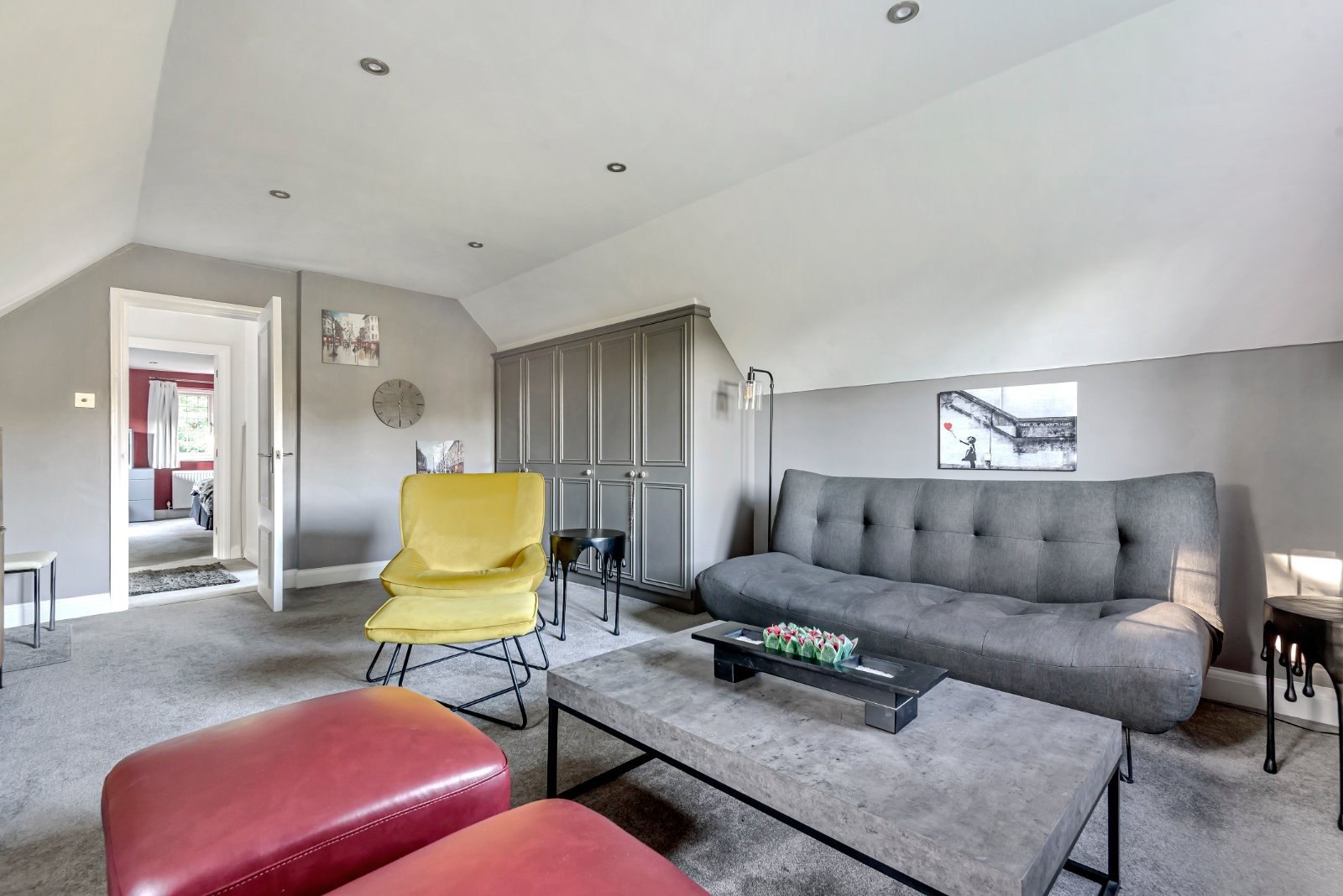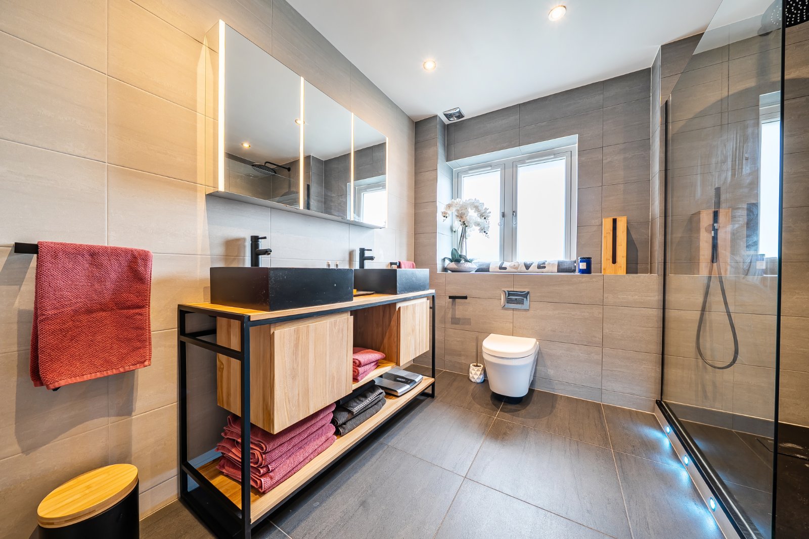 The final two bedrooms are located on the second floor. Both are generously sized doubles and benefit from floor-to-ceiling built-in wardrobes, as well as useful eaves storage. A central bathroom serves both rooms and features a P-shaped bath with an overhead shower. The wash basin is set into an attractive drawer storage unit, providing both style and practicality.