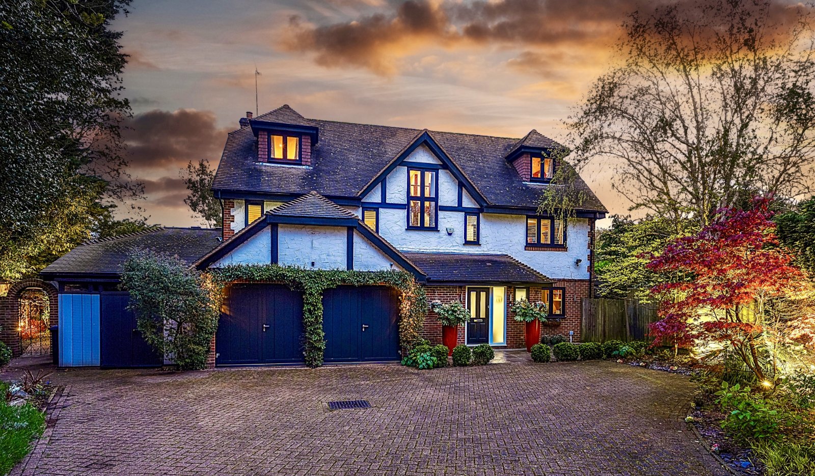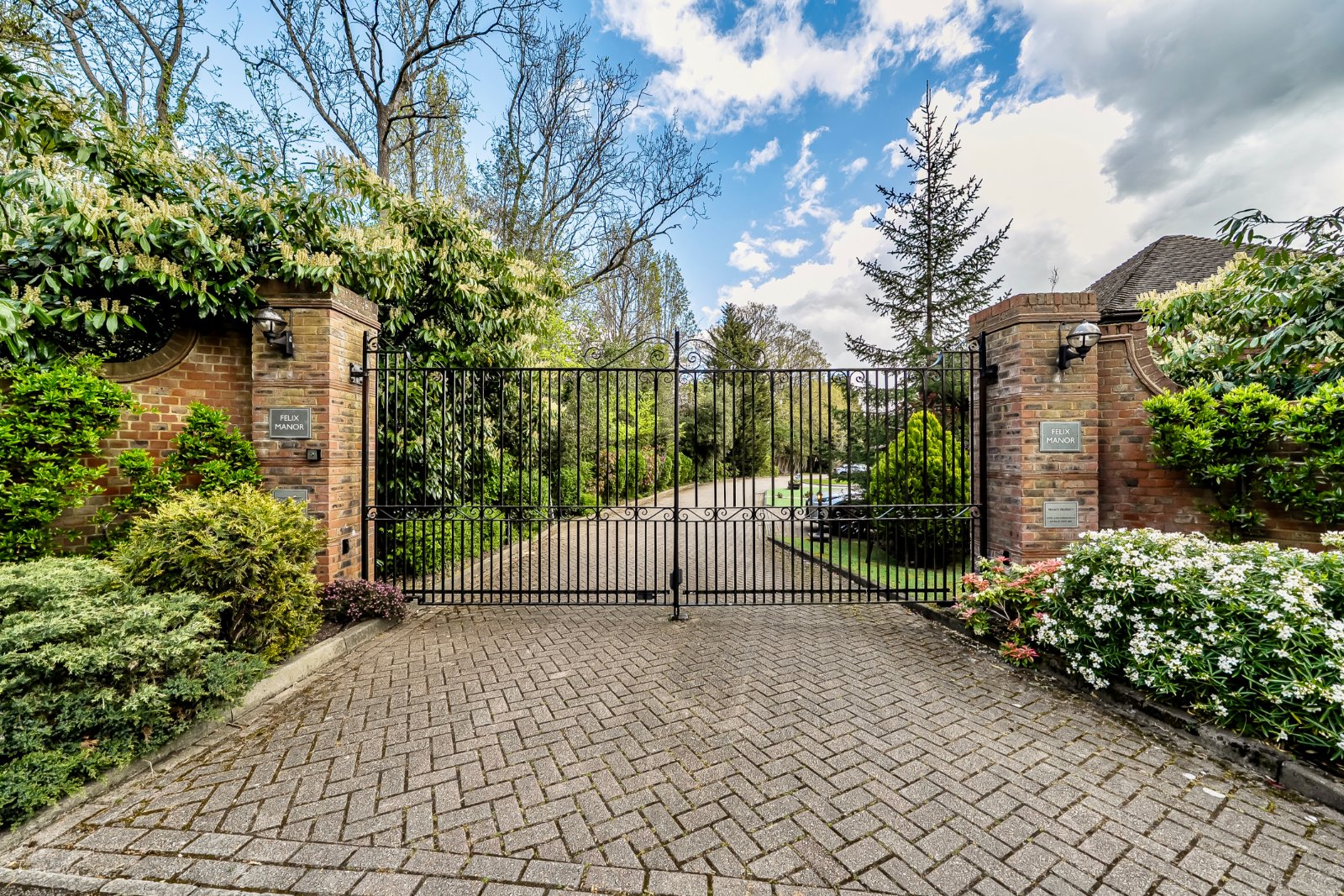 A block-paved driveway leads along Felix Manor via wrought iron gates, opening onto a beautifully landscaped approach. The property is positioned at the end of the close, beyond three other substantial homes within this exclusive private enclave. To the front of this house, there is a generous block-paved driveway bordered by mature planting, providing ample off-street parking for several vehicles.