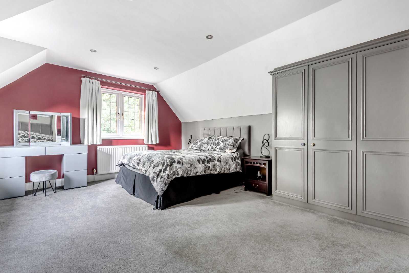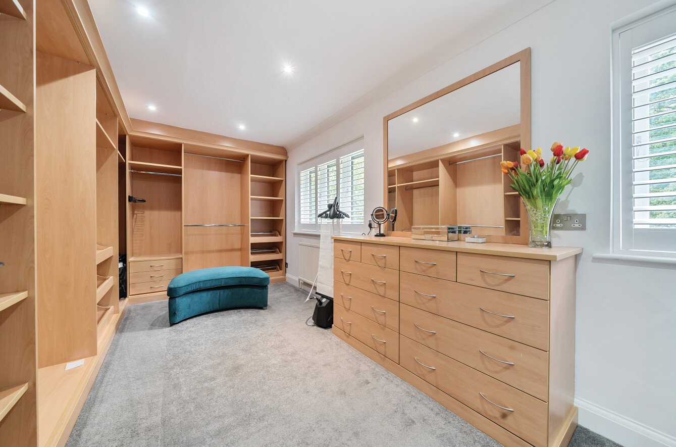 Bedroom two is a well-proportioned double room with a full wall of floor-to-ceiling built-in wardrobes. A further room, currently beautifully fitted as an additional dressing room, could alternatively serve as a fifth bedroom. The family bathroom is equally impressive, featuring a shower and twin basins set on a stylish storage unit with mirrored cabinet above.