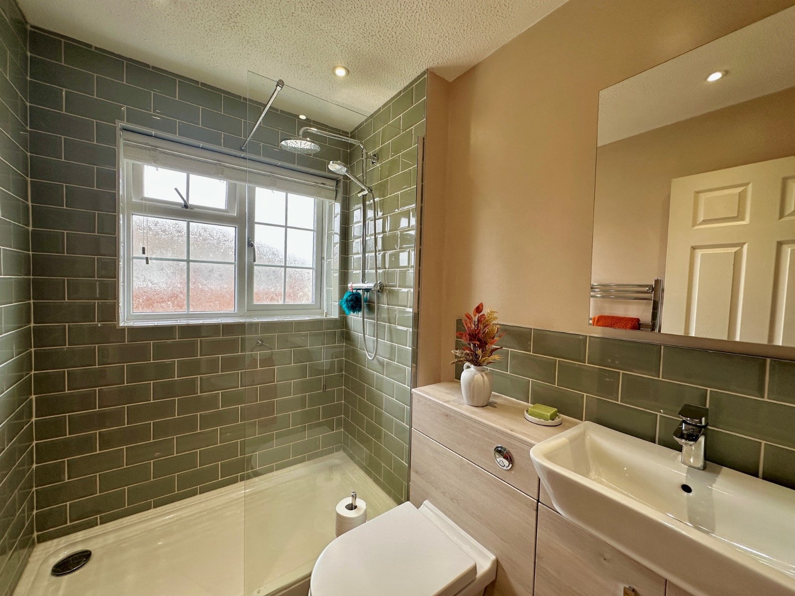 To the first floor there are three bedrooms, two doubles, one with a fitted wardrobe, and a small single. There is a recently installed and well-appointed family shower room with a walk-in shower.