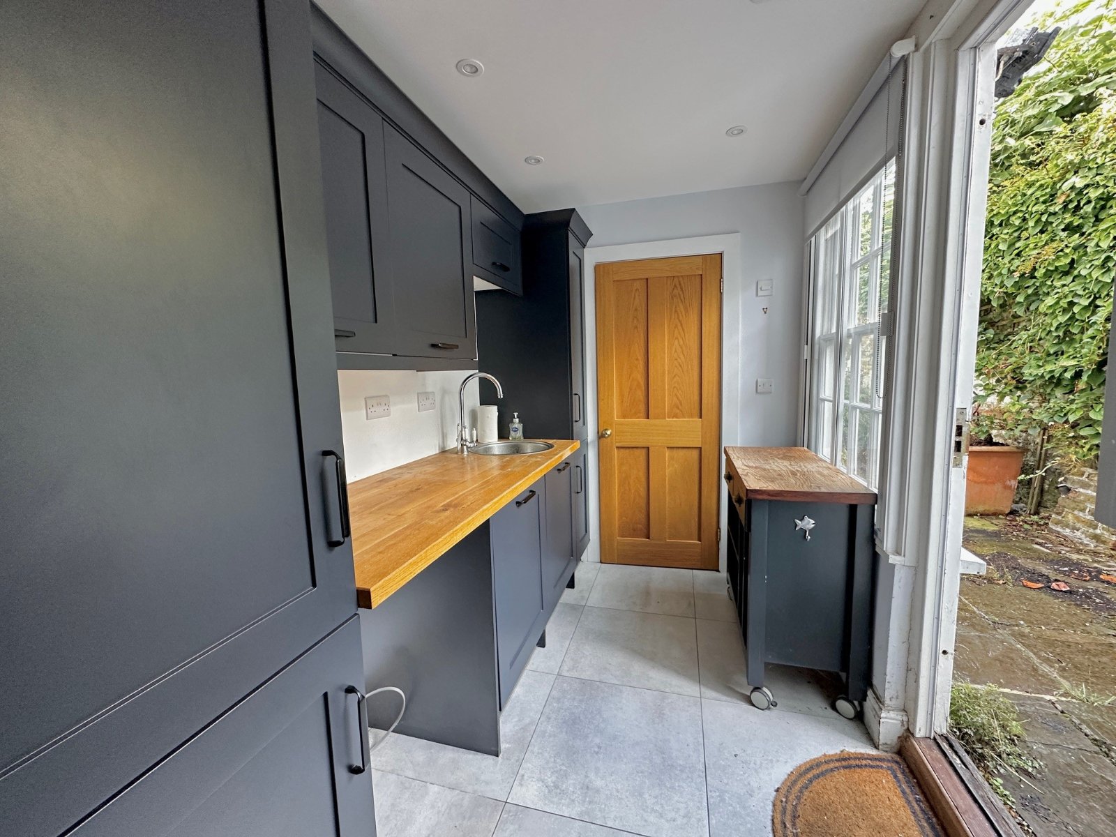 The front door opens to the entrance hall off which is a sitting room with window to the front elevation. Down the hall to the rear of the house is access to the cellar before leading through to a fabulous solid wood fitted kitchen with a range of builtin appliances and storage and finished with a marble work top. This room also enjoys a fitted cast iron wood burner. The kitchen units continue through to the utility room beyond, giving access to the garden. Off the utility is a useful ground floor shower room.